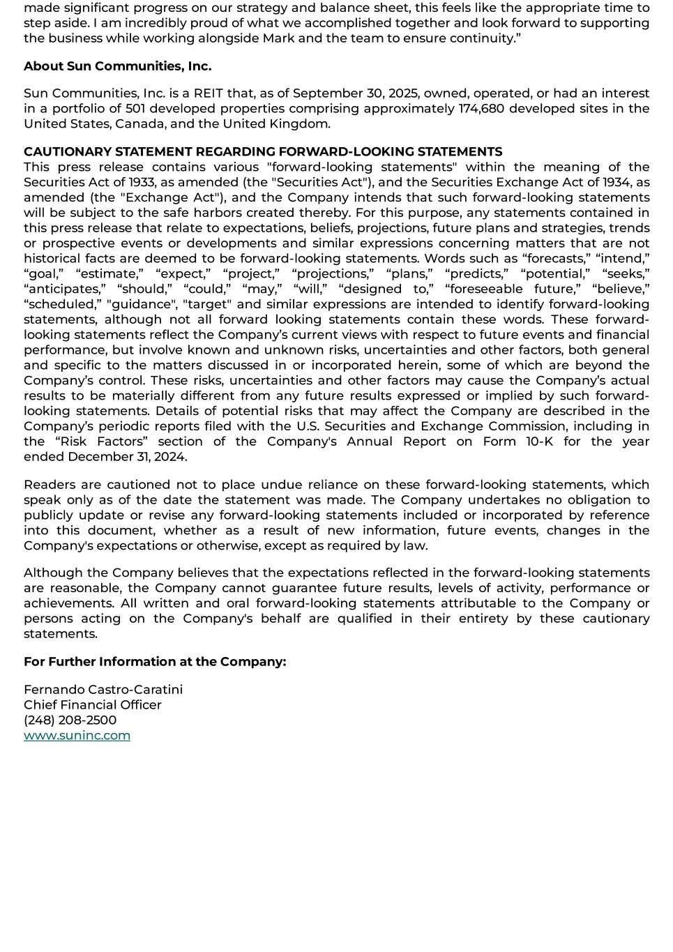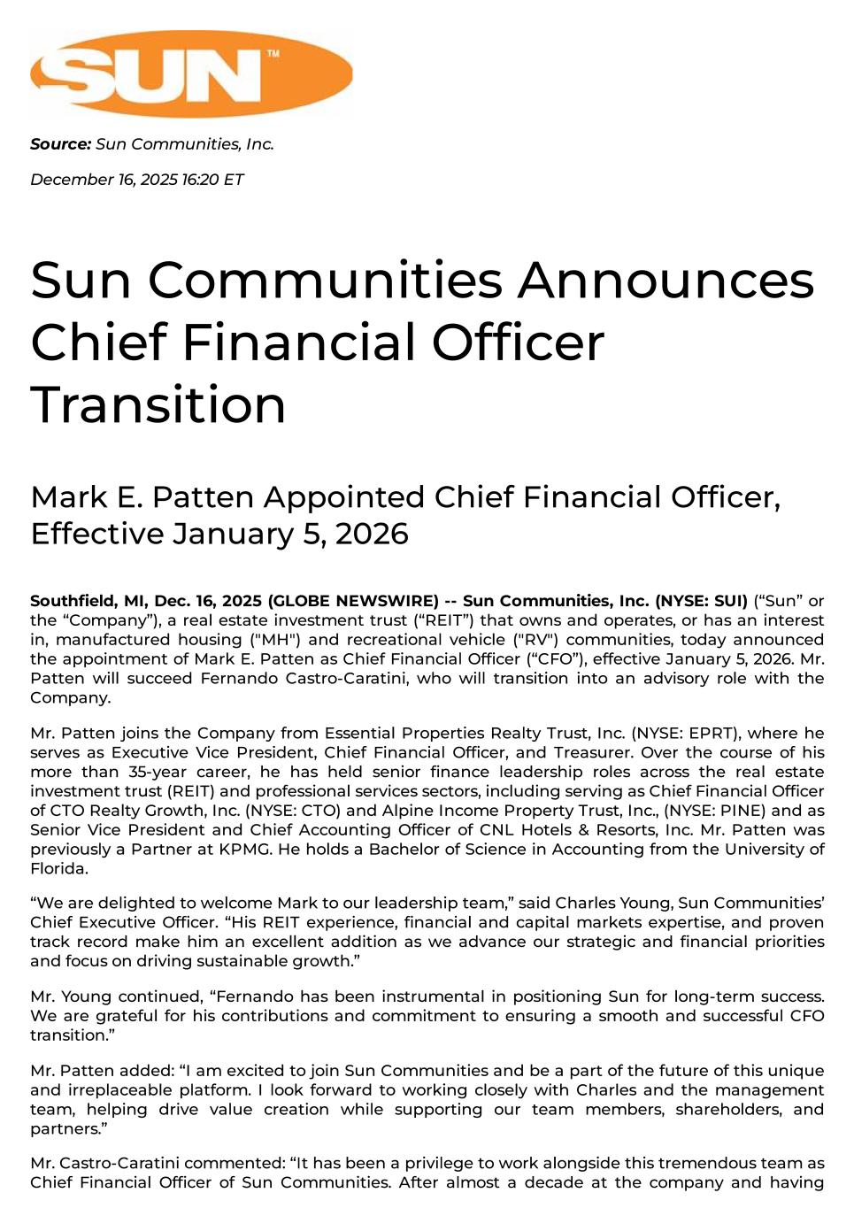 THIS EMPLOYMENT AGREEMENT (this “Agreement”), effective as of December 11, 2025 (the “Effective Date”), by and among SUN COMMUNITIES, INC., a Maryland corporation (the “REIT”), SUN COMMUNITIES OPERATING LIMITED PARTNERSHIP, a Michigan limited partnership (“SCOLP”), and Mark E. Patten (the “Executive”). As used herein, “Company” shall refer to the REIT and SCOLP together.
