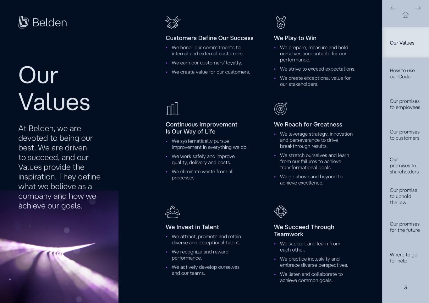Our Values At Belden, we are devoted to being our best. We are driven to succeed, and our Values provide the inspiration. They define what we believe as a company and how we achieve our goals. Customers Define Our Success • We honor our commitments to internal and external customers. • We earn our customers’ loyalty. • We create value for our customers. Continuous Improvement Is Our Way of Life • We systematically pursue improvement in everything we do. • We work safely and improve quality, delivery and costs. • We eliminate waste from all processes. We Invest in Talent • We attract, promote and retain diverse and exceptional talent. • We recognize and reward performance. • We actively develop ourselves and our teams. We Play to Win • We prepare, measure and hold ourselves accountable for our performance. • We strive to exceed expectations. • We create exceptional value for our stakeholders. We Reach for Greatness • We leverage strategy, innovation and perseverance to drive breakthrough results. • We stretch ourselves and learn from our failures to achieve transformational goals. • We go above and beyond to achieve excellence. We Succeed Through Teamwork • We support and learn from each other. • We practice inclusivity and embrace diverse perspectives. • We listen and collaborate to achieve common goals. Our Values How to use our Code Our promises to employees Our promises to customers Our promises to shareholders Our promise to uphold the law Our promises for the future Where to go for help 3