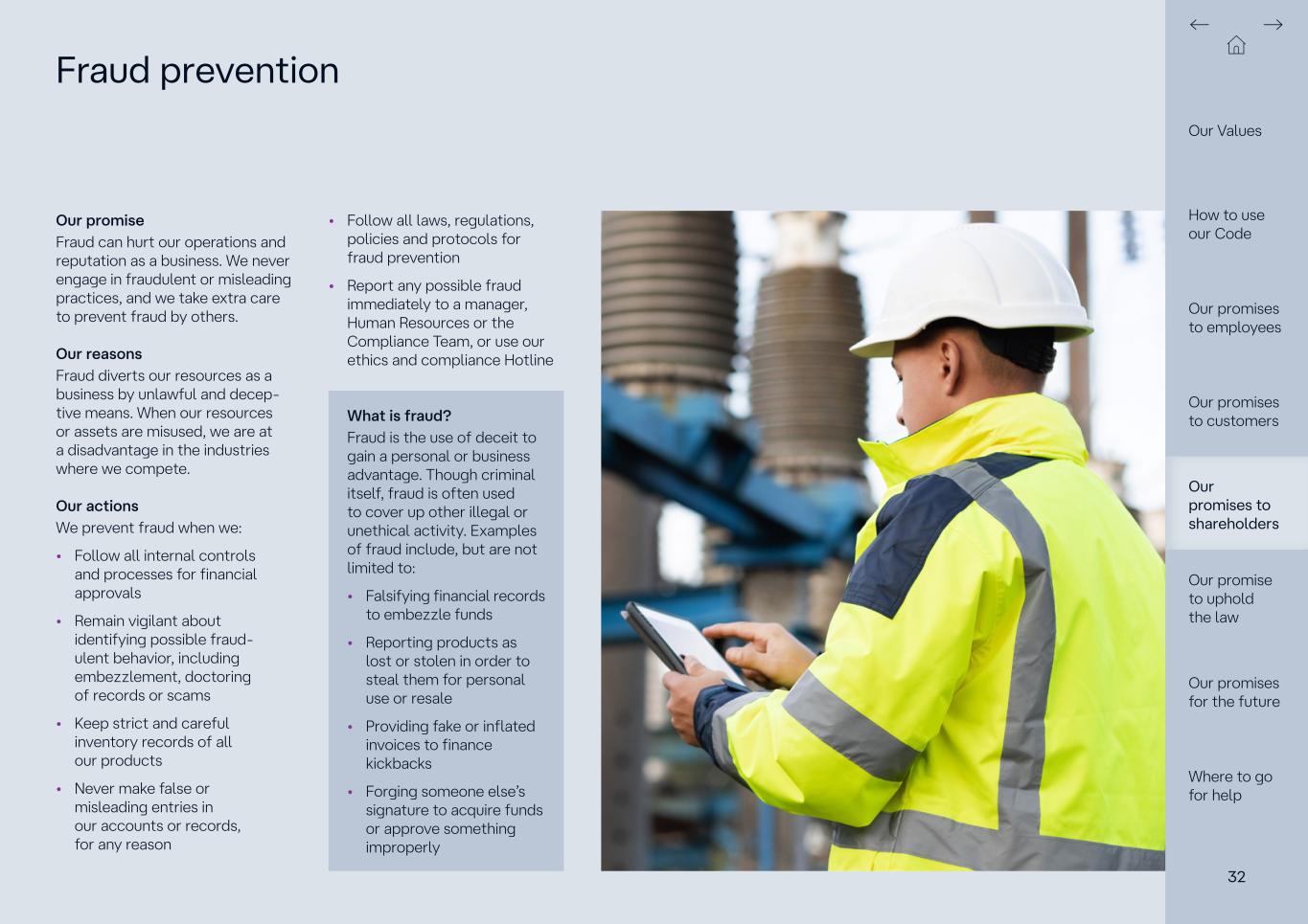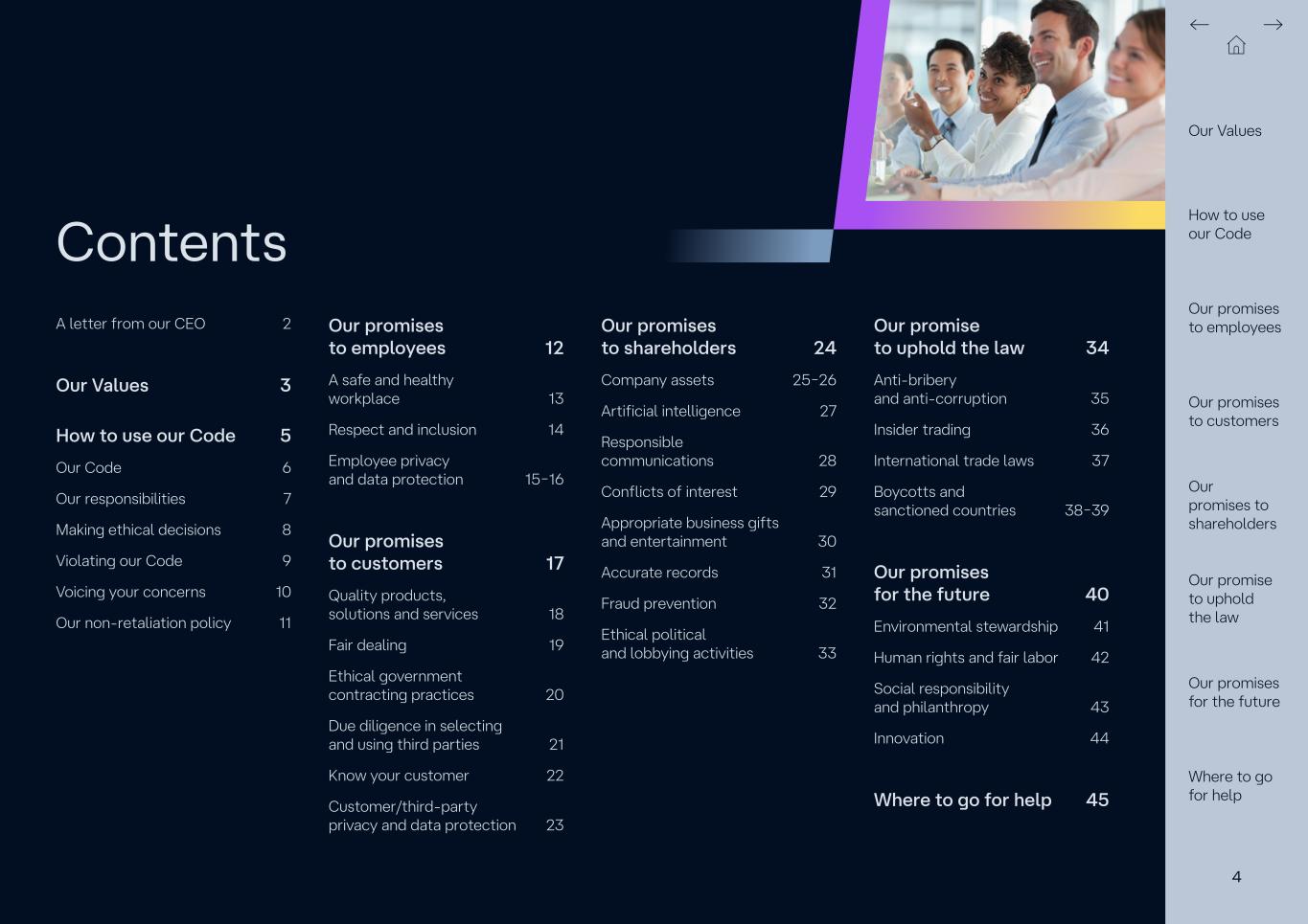 A letter from our CEO 2 Our Values 3 How to use our Code 5 Our Code 6 Our responsibilities 7 Making ethical decisions 8 Violating our Code 9 Voicing your concerns 10 Our non-retaliation policy 11 Our promises to employees 12 A safe and healthy workplace 13 Respect and inclusion 14 Employee privacy and data protection 15–16 Our promises to customers 17 Quality products, solutions and services 18 Fair dealing 19 Ethical government contracting practices 20 Due diligence in selecting and using third parties 21 Know your customer 22 Customer/third-party privacy and data protection 23 Contents Our promises to shareholders 24 Company assets 25–26 Artificial intelligence 27 Responsible communications 28 Conflicts of interest 29 Appropriate business gifts and entertainment 30 Accurate records 31 Fraud prevention 32 Ethical political and lobbying activities 33 Our promise to uphold the law 34 Anti-bribery and anti-corruption 35 Insider trading 36 International trade laws 37 Boycotts and sanctioned countries 38–39 Our promises for the future 40 Environmental stewardship 41 Human rights and fair labor 42 Social responsibility and philanthropy 43 Innovation 44 Where to go for help 45 Our Values How to use our Code Our promises to employees Our promises to customers Our promises to shareholders Our promise to uphold the law Our promises for the future Where to go for help 4