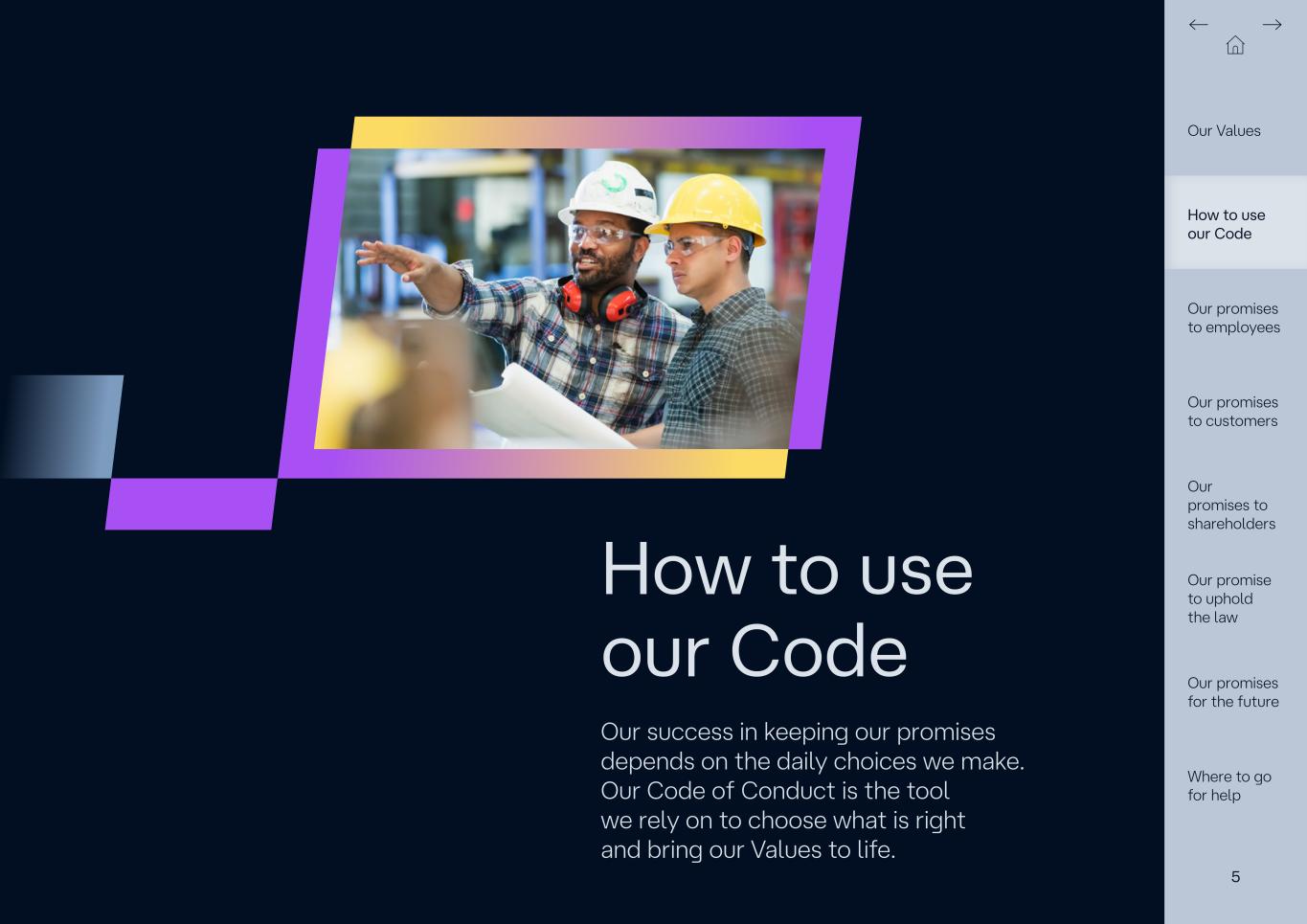 How to use our Code Our success in keeping our promises depends on the daily choices we make. Our Code of Conduct is the tool we rely on to choose what is right and bring our Values to life. Our Values Our promises to employees Our promises to customers Our promises to shareholders Our promise to uphold the law Our promises for the future Where to go for help 5 How to use our Code