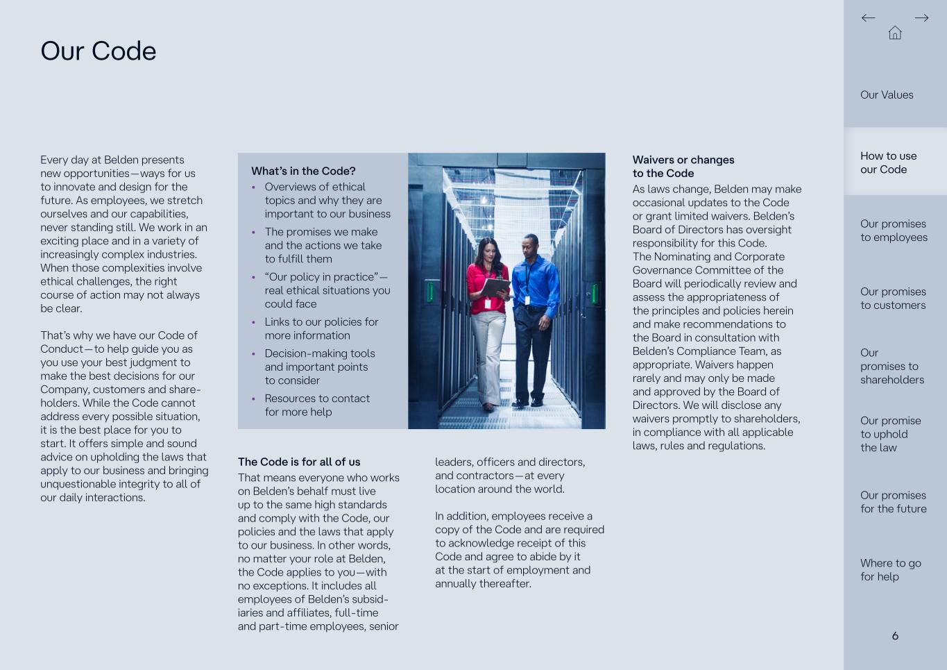 Our Code Every day at Belden presents new opportunities — ways for us to innovate and design for the future. As employees, we stretch ourselves and our capabilities, never standing still. We work in an exciting place and in a variety of increasingly complex industries. When those complexities involve ethical challenges, the right course of action may not always be clear. That’s why we have our Code of Conduct — to help guide you as you use your best judgment to make the best decisions for our Company, customers and share- holders. While the Code cannot address every possible situation, it is the best place for you to start. It offers simple and sound advice on upholding the laws that apply to our business and bringing unquestionable integrity to all of our daily interactions. What’s in the Code? • Overviews of ethical topics and why they are important to our business • The promises we make and the actions we take to fulfill them • “Our policy in practice” — real ethical situations you could face • Links to our policies for more information • Decision-making tools and important points to consider • Resources to contact for more help The Code is for all of us That means everyone who works on Belden’s behalf must live up to the same high standards and comply with the Code, our policies and the laws that apply to our business. In other words, no matter your role at Belden, the Code applies to you — with no exceptions. It includes all employees of Belden’s subsid- iaries and affiliates, full-time and part-time employees, senior leaders, officers and directors, and contractors — at every location around the world. In addition, employees receive a copy of the Code and are required to acknowledge receipt of this Code and agree to abide by it at the start of employment and annually thereafter. Waivers or changes to the Code As laws change, Belden may make occasional updates to the Code or grant limited waivers. Belden’s Board of Directors has oversight responsibility for this Code. The Nominating and Corporate Governance Committee of the Board will periodically review and assess the appropriateness of the principles and policies herein and make recommendations to the Board in consultation with Belden’s Compliance Team, as appropriate. Waivers happen rarely and may only be made and approved by the Board of Directors. We will disclose any waivers promptly to shareholders, in compliance with all applicable laws, rules and regulations. Our Values Our promises to employees Our promises to customers Our promises to shareholders Our promise to uphold the law Our promises for the future Where to go for help 6 How to use our Code