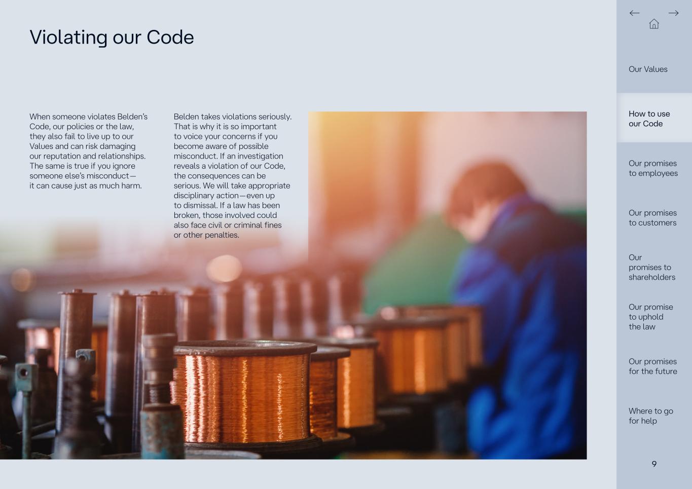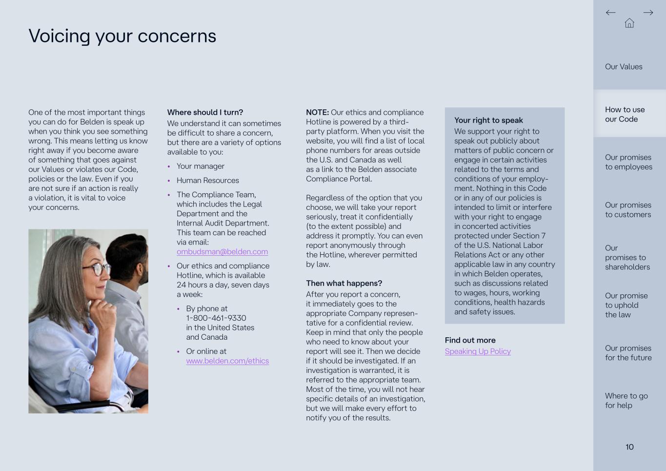 Violating our Code When someone violates Belden’s Code, our policies or the law, they also fail to live up to our Values and can risk damaging our reputation and relationships. The same is true if you ignore someone else’s misconduct — it can cause just as much harm. Belden takes violations seriously. That is why it is so important to voice your concerns if you become aware of possible misconduct. If an investigation reveals a violation of our Code, the consequences can be serious. We will take appropriate disciplinary action — even up to dismissal. If a law has been broken, those involved could also face civil or criminal fines or other penalties. Our Values Our promises to employees Our promises to customers Our promises to shareholders Our promise to uphold the law Our promises for the future Where to go for help 9 How to use our Code