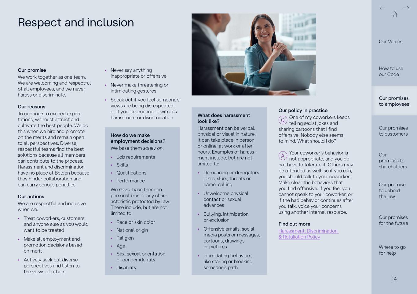Respect and inclusion Our promise We work together as one team. We are welcoming and respectful of all employees, and we never harass or discriminate. Our reasons To continue to exceed expec- tations, we must attract and cultivate the best people. We do this when we hire and promote on the merits and remain open to all perspectives. Diverse, respectful teams find the best solutions because all members can contribute to the process. Harassment and discrimination have no place at Belden because they hinder collaboration and can carry serious penalties. Our actions We are respectful and inclusive when we: • Treat coworkers, customers and anyone else as you would want to be treated • Make all employment and promotion decisions based on merit • Actively seek out diverse perspectives and listen to the views of others • Never say anything inappropriate or offensive • Never make threatening or intimidating gestures • Speak out if you feel someone’s views are being disrespected, or if you experience or witness harassment or discrimination How do we make employment decisions? We base them solely on: • Job requirements • Skills • Qualifications • Performance We never base them on personal bias or any char- acteristic protected by law. These include, but are not limited to: • Race or skin color • National origin • Religion • Age • Sex, sexual orientation or gender identity • Disability What does harassment look like? Harassment can be verbal, physical or visual in nature. It can take place in person or online, at work or after hours. Examples of harass- ment include, but are not limited to: • Demeaning or derogatory jokes, slurs, threats or name-calling • Unwelcome physical contact or sexual advances • Bullying, intimidation or exclusion • Offensive emails, social media posts or messages, cartoons, drawings or pictures • Intimidating behaviors, like staring or blocking someone’s path Our policy in practice Q One of my coworkers keeps telling sexist jokes and sharing cartoons that I find offensive. Nobody else seems to mind. What should I do? A Your coworker’s behavior is not appropriate, and you do not have to tolerate it. Others may be offended as well, so if you can, you should talk to your coworker. Make clear the behaviors that you find offensive. If you feel you cannot speak to your coworker, or if the bad behavior continues after you talk, voice your concerns using another internal resource. Find out more Harassment, Discrimination & Retaliation Policy Our Values How to use our Code Our promises to customers Our promises to shareholders Our promise to uphold the law Our promises for the future Where to go for help 14 Our promises to employees