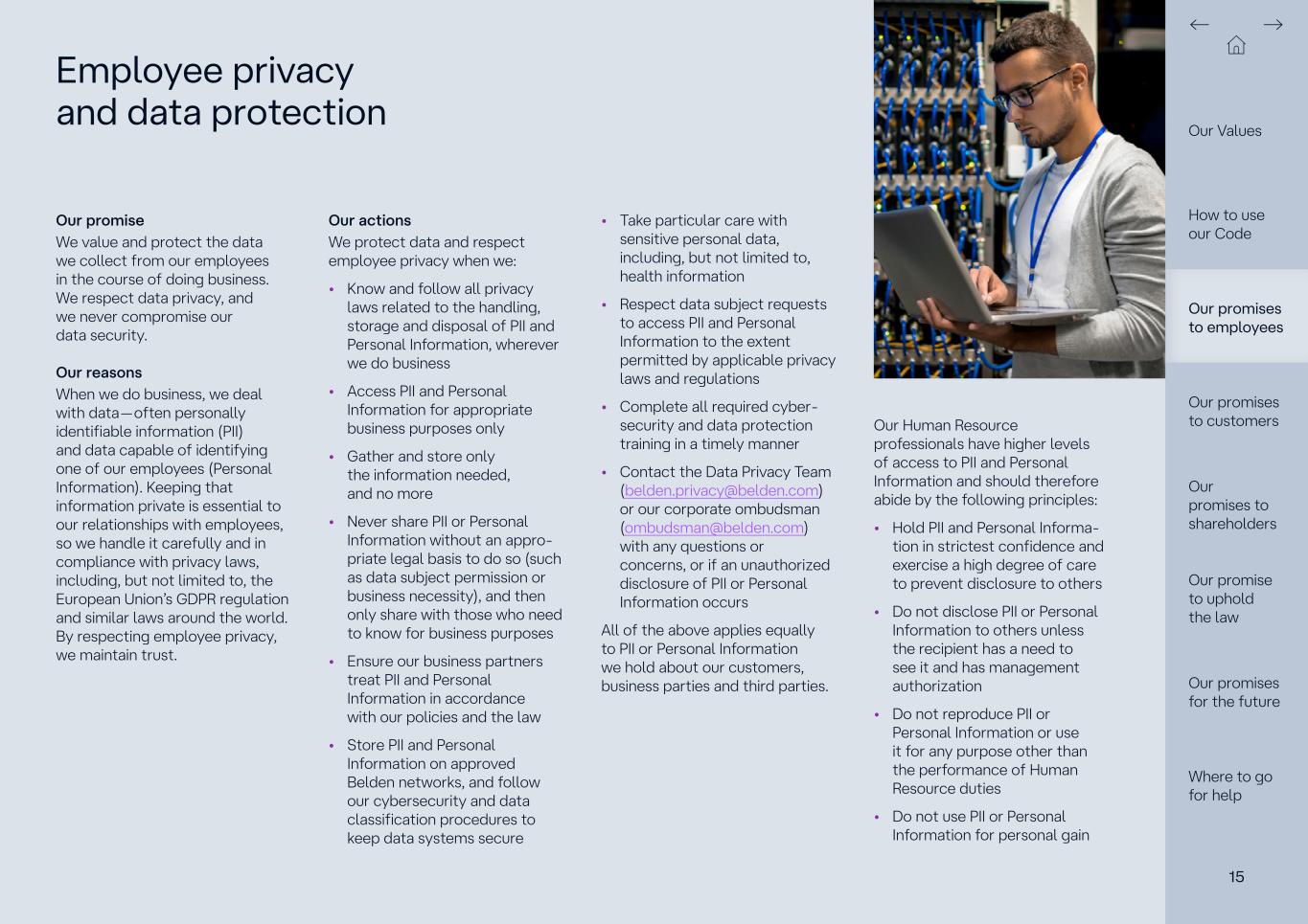 Employee privacy and data protection Our promise We value and protect the data we collect from our employees in the course of doing business. We respect data privacy, and we never compromise our data security. Our reasons When we do business, we deal with data — often personally identifiable information (PII) and data capable of identifying one of our employees (Personal Information). Keeping that information private is essential to our relationships with employees, so we handle it carefully and in compliance with privacy laws, including, but not limited to, the European Union’s GDPR regulation and similar laws around the world. By respecting employee privacy, we maintain trust. Our actions We protect data and respect employee privacy when we: • Know and follow all privacy laws related to the handling, storage and disposal of PII and Personal Information, wherever we do business • Access PII and Personal Information for appropriate business purposes only • Gather and store only the information needed, and no more • Never share PII or Personal Information without an appro- priate legal basis to do so (such as data subject permission or business necessity), and then only share with those who need to know for business purposes • Ensure our business partners treat PII and Personal Information in accordance with our policies and the law • Store PII and Personal Information on approved Belden networks, and follow our cybersecurity and data classification procedures to keep data systems secure • Take particular care with sensitive personal data, including, but not limited to, health information • Respect data subject requests to access PII and Personal Information to the extent permitted by applicable privacy laws and regulations • Complete all required cyber- security and data protection training in a timely manner • Contact the Data Privacy Team (belden.privacy@belden.com) or our corporate ombudsman (ombudsman@belden.com) with any questions or concerns, or if an unauthorized disclosure of PII or Personal Information occurs All of the above applies equally to PII or Personal Information we hold about our customers, business parties and third parties. Our Human Resource professionals have higher levels of access to PII and Personal Information and should therefore abide by the following principles: • Hold PII and Personal Informa- tion in strictest confidence and exercise a high degree of care to prevent disclosure to others • Do not disclose PII or Personal Information to others unless the recipient has a need to see it and has management authorization • Do not reproduce PII or Personal Information or use it for any purpose other than the performance of Human Resource duties • Do not use PII or Personal Information for personal gain Our Values How to use our Code Our promises to customers Our promises to shareholders Our promise to uphold the law Our promises for the future Where to go for help 15 Our promises to employees