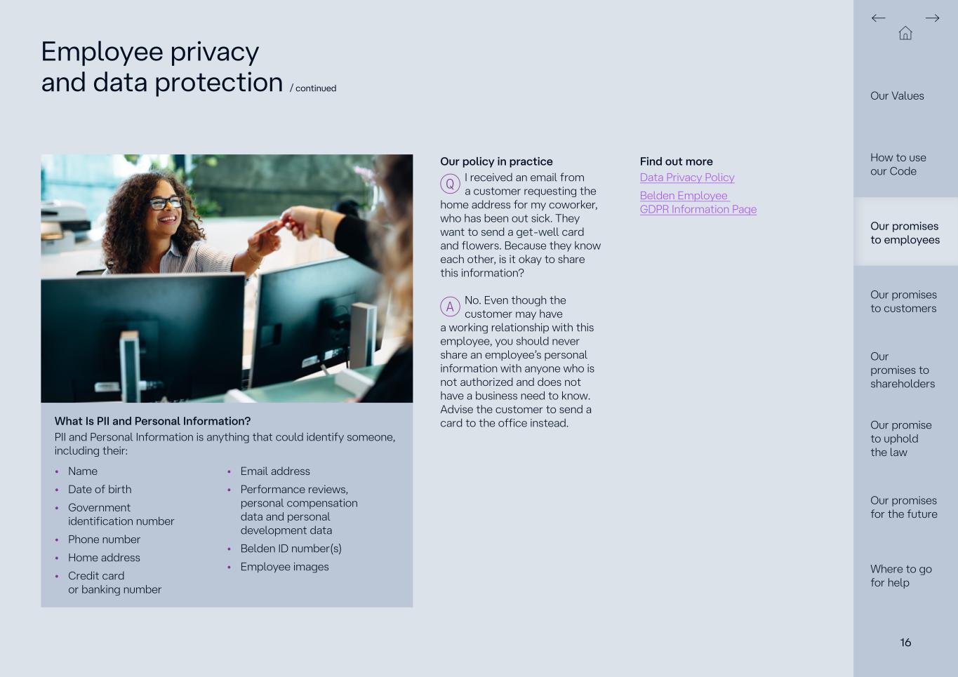 Employee privacy and data protection / continued Our policy in practice Q I received an email from a customer requesting the home address for my coworker, who has been out sick. They want to send a get-well card and flowers. Because they know each other, is it okay to share this information? A No. Even though the customer may have a working relationship with this employee, you should never share an employee’s personal information with anyone who is not authorized and does not have a business need to know. Advise the customer to send a card to the office instead. Find out more Data Privacy Policy Belden Employee GDPR Information Page What Is PII and Personal Information? PII and Personal Information is anything that could identify someone, including their: • Name • Date of birth • Government identification number • Phone number • Home address • Credit card or banking number • Email address • Performance reviews, personal compensation data and personal development data • Belden ID number(s) • Employee images Our Values How to use our Code Our promises to customers Our promises to shareholders Our promise to uphold the law Our promises for the future Where to go for help 16 Our promises to employees