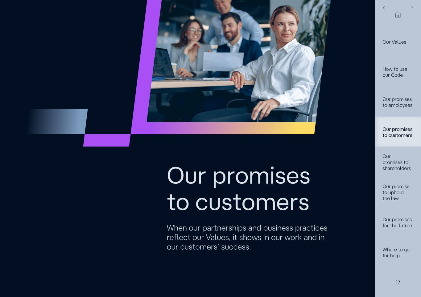 Our promises to customers When our partnerships and business practices reflect our Values, it shows in our work and in our customers’ success. Our Values How to use our Code Our promises to employees Our promises to shareholders Our promise to uphold the law Our promises for the future Where to go for help 17 Our promises to customers
