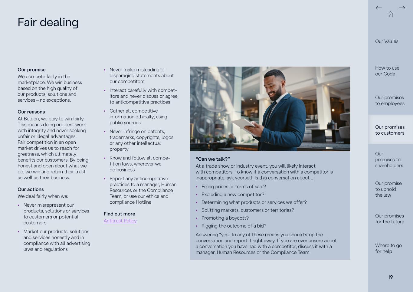 Fair dealing Our promise We compete fairly in the marketplace. We win business based on the high quality of our products, solutions and services — no exceptions. Our reasons At Belden, we play to win fairly. This means doing our best work with integrity and never seeking unfair or illegal advantages. Fair competition in an open market drives us to reach for greatness, which ultimately benefits our customers. By being honest and open about what we do, we win and retain their trust as well as their business. Our actions We deal fairly when we: • Never misrepresent our products, solutions or services to customers or potential customers • Market our products, solutions and services honestly and in compliance with all advertising laws and regulations • Never make misleading or disparaging statements about our competitors • Interact carefully with compet- itors and never discuss or agree to anticompetitive practices • Gather all competitive information ethically, using public sources • Never infringe on patents, trademarks, copyrights, logos or any other intellectual property • Know and follow all compe- tition laws, wherever we do business • Report any anticompetitive practices to a manager, Human Resources or the Compliance Team, or use our ethics and compliance Hotline Find out more Antitrust Policy “Can we talk?” At a trade show or industry event, you will likely interact with competitors. To know if a conversation with a competitor is inappropriate, ask yourself: Is this conversation about … • Fixing prices or terms of sale? • Excluding a new competitor? • Determining what products or services we offer? • Splitting markets, customers or territories? • Promoting a boycott? • Rigging the outcome of a bid? Answering “yes” to any of these means you should stop the conversation and report it right away. If you are ever unsure about a conversation you have had with a competitor, discuss it with a manager, Human Resources or the Compliance Team. Our Values How to use our Code Our promises to employees Our promises to shareholders Our promise to uphold the law Our promises for the future Where to go for help 19 Our promises to customers