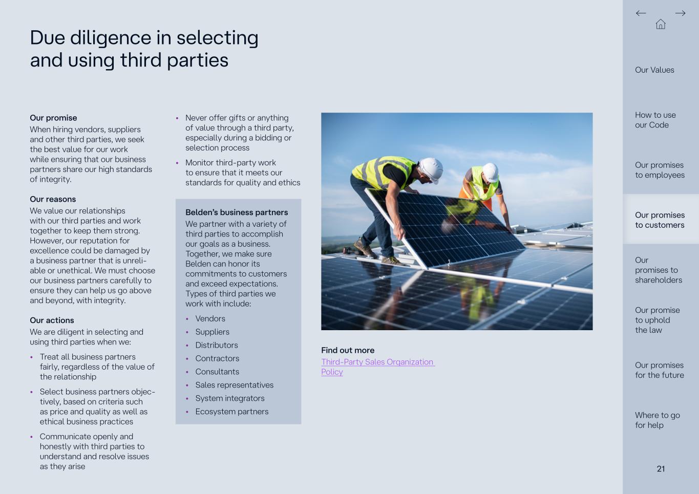 Due diligence in selecting and using third parties Our promise When hiring vendors, suppliers and other third parties, we seek the best value for our work while ensuring that our business partners share our high standards of integrity. Our reasons We value our relationships with our third parties and work together to keep them strong. However, our reputation for excellence could be damaged by a business partner that is unreli- able or unethical. We must choose our business partners carefully to ensure they can help us go above and beyond, with integrity. Our actions We are diligent in selecting and using third parties when we: • Treat all business partners fairly, regardless of the value of the relationship • Select business partners objec- tively, based on criteria such as price and quality as well as ethical business practices • Communicate openly and honestly with third parties to understand and resolve issues as they arise • Never offer gifts or anything of value through a third party, especially during a bidding or selection process • Monitor third-party work to ensure that it meets our standards for quality and ethics Belden’s business partners We partner with a variety of third parties to accomplish our goals as a business. Together, we make sure Belden can honor its commitments to customers and exceed expectations. Types of third parties we work with include: • Vendors • Suppliers • Distributors • Contractors • Consultants • Sales representatives • System integrators • Ecosystem partners Find out more Third-Party Sales Organization Policy Our Values How to use our Code Our promises to employees Our promises to shareholders Our promise to uphold the law Our promises for the future Where to go for help 21 Our promises to customers