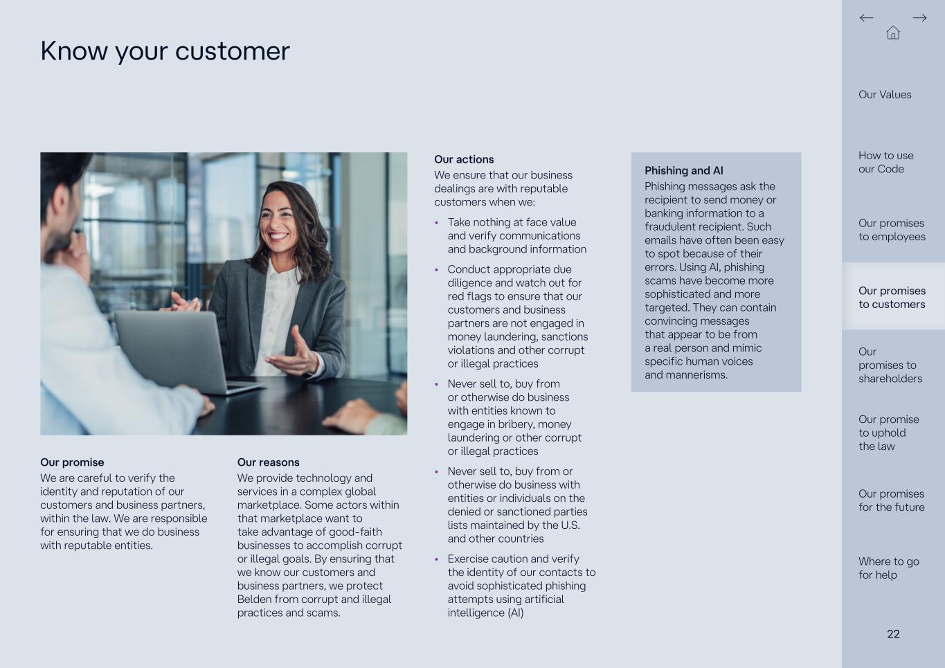 Know your customer Our promise We are careful to verify the identity and reputation of our customers and business partners, within the law. We are responsible for ensuring that we do business with reputable entities. Our reasons We provide technology and services in a complex global marketplace. Some actors within that marketplace want to take advantage of good-faith businesses to accomplish corrupt or illegal goals. By ensuring that we know our customers and business partners, we protect Belden from corrupt and illegal practices and scams. Our actions We ensure that our business dealings are with reputable customers when we: • Take nothing at face value and verify communications and background information • Conduct appropriate due diligence and watch out for red flags to ensure that our customers and business partners are not engaged in money laundering, sanctions violations and other corrupt or illegal practices • Never sell to, buy from or otherwise do business with entities known to engage in bribery, money laundering or other corrupt or illegal practices • Never sell to, buy from or otherwise do business with entities or individuals on the denied or sanctioned parties lists maintained by the U.S. and other countries • Exercise caution and verify the identity of our contacts to avoid sophisticated phishing attempts using artificial intelligence (AI) Phishing and AI Phishing messages ask the recipient to send money or banking information to a fraudulent recipient. Such emails have often been easy to spot because of their errors. Using AI, phishing scams have become more sophisticated and more targeted. They can contain convincing messages that appear to be from a real person and mimic specific human voices and mannerisms. Our Values How to use our Code Our promises to employees Our promises to shareholders Our promise to uphold the law Our promises for the future Where to go for help 22 Our promises to customers