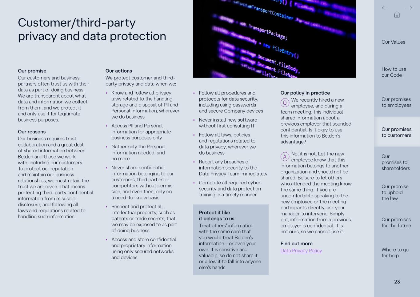 Customer/third-party privacy and data protection Our promise Our customers and business partners often trust us with their data as part of doing business. We are transparent about what data and information we collect from them, and we protect it and only use it for legitimate business purposes. Our reasons Our business requires trust, collaboration and a great deal of shared information between Belden and those we work with, including our customers. To protect our reputation and maintain our business relationships, we must retain the trust we are given. That means protecting third-party confidential information from misuse or disclosure, and following all laws and regulations related to handling such information. Our actions We protect customer and third- party privacy and data when we: • Know and follow all privacy laws related to the handling, storage and disposal of PII and Personal Information, wherever we do business • Access PII and Personal Information for appropriate business purposes only • Gather only the Personal Information needed, and no more • Never share confidential information belonging to our customers, third parties or competitors without permis- sion, and even then, only on a need-to-know basis • Respect and protect all intellectual property, such as patents or trade secrets, that we may be exposed to as part of doing business • Access and store confidential and proprietary information using only secured networks and devices • Follow all procedures and protocols for data security, including using passwords and secure Company devices • Never install new software without first consulting IT • Follow all laws, policies and regulations related to data privacy, wherever we do business • Report any breaches of information security to the Data Privacy Team immediately • Complete all required cyber- security and data protection training in a timely manner Protect it like it belongs to us Treat others’ information with the same care that you would treat Belden’s information — or even your own. It is sensitive and valuable, so do not share it or allow it to fall into anyone else’s hands. Our policy in practice Q We recently hired a new employee, and during a team meeting, this individual shared information about a previous employer that sounded confidential. Is it okay to use this information to Belden’s advantage? A No, it is not. Let the new employee know that this information belongs to another organization and should not be shared. Be sure to let others who attended the meeting know the same thing. If you are uncomfortable speaking to the new employee or the meeting participants directly, ask your manager to intervene. Simply put, information from a previous employer is confidential. It is not ours, so we cannot use it. Find out more Data Privacy Policy Our Values How to use our Code Our promises to employees Our promises to shareholders Our promise to uphold the law Our promises for the future Where to go for help 23 Our promises to customers