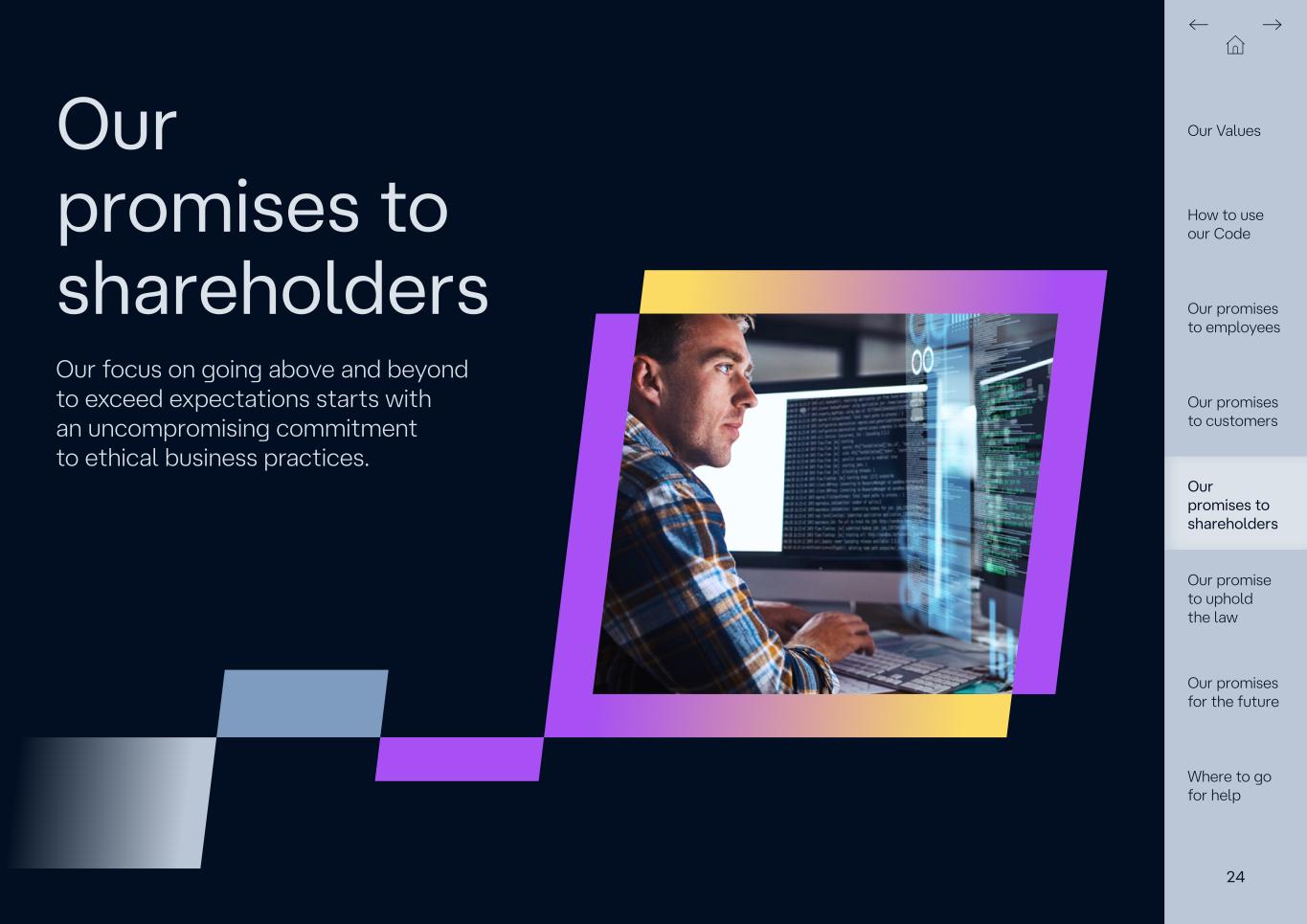 Our promises to shareholders Our focus on going above and beyond to exceed expectations starts with an uncompromising commitment to ethical business practices. Our Values How to use our Code Our promises to employees Our promises to customers Our promises to shareholders Our promise to uphold the law Our promises for the future Where to go for help 24 r