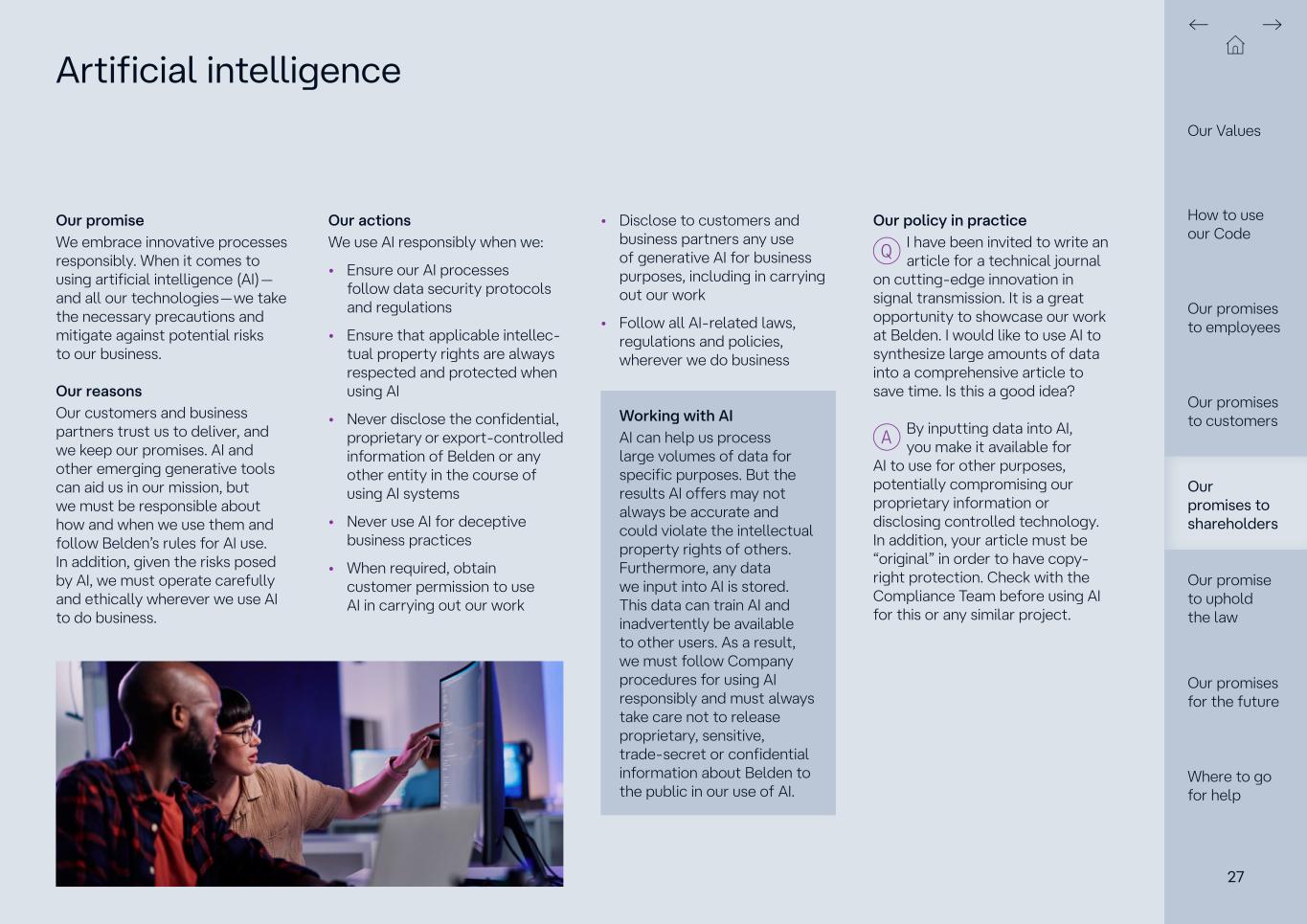 Artificial intelligence Our promise We embrace innovative processes responsibly. When it comes to using artificial intelligence (AI) — and all our technologies — we take the necessary precautions and mitigate against potential risks to our business. Our reasons Our customers and business partners trust us to deliver, and we keep our promises. AI and other emerging generative tools can aid us in our mission, but we must be responsible about how and when we use them and follow Belden’s rules for AI use. In addition, given the risks posed by AI, we must operate carefully and ethically wherever we use AI to do business. Our actions We use AI responsibly when we: • Ensure our AI processes follow data security protocols and regulations • Ensure that applicable intellec- tual property rights are always respected and protected when using AI • Never disclose the confidential, proprietary or export-controlled information of Belden or any other entity in the course of using AI systems • Never use AI for deceptive business practices • When required, obtain customer permission to use AI in carrying out our work • Disclose to customers and business partners any use of generative AI for business purposes, including in carrying out our work • Follow all AI-related laws, regulations and policies, wherever we do business Working with AI AI can help us process large volumes of data for specific purposes. But the results AI offers may not always be accurate and could violate the intellectual property rights of others. Furthermore, any data we input into AI is stored. This data can train AI and inadvertently be available to other users. As a result, we must follow Company procedures for using AI responsibly and must always take care not to release proprietary, sensitive, trade-secret or confidential information about Belden to the public in our use of AI. Our policy in practice Q I have been invited to write an article for a technical journal on cutting-edge innovation in signal transmission. It is a great opportunity to showcase our work at Belden. I would like to use AI to synthesize large amounts of data into a comprehensive article to save time. Is this a good idea? A By inputting data into AI, you make it available for AI to use for other purposes, potentially compromising our proprietary information or disclosing controlled technology. In addition, your article must be “original” in order to have copy- right protection. Check with the Compliance Team before using AI for this or any similar project. Our Values How to use our Code Our promises to employees Our promises to customers Our promise to uphold the law Our promises for the future Where to go for help 27 Our promises to shareholders