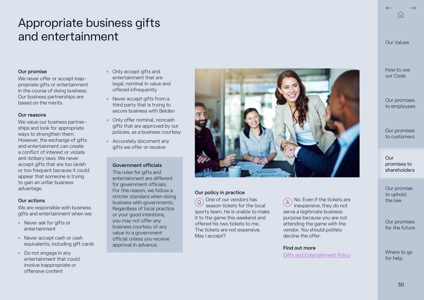 Appropriate business gifts and entertainment Our promise We never offer or accept inap- propriate gifts or entertainment in the course of doing business. Our business partnerships are based on the merits. Our reasons We value our business partner- ships and look for appropriate ways to strengthen them. However, the exchange of gifts and entertainment can create a conflict of interest or violate anti-bribery laws. We never accept gifts that are too lavish or too frequent because it could appear that someone is trying to gain an unfair business advantage. Our actions We are responsible with business gifts and entertainment when we: • Never ask for gifts or entertainment • Never accept cash or cash equivalents, including gift cards • Do not engage in any entertainment that could involve inappropriate or offensive content • Only accept gifts and entertainment that are legal, nominal in value and offered infrequently • Never accept gifts from a third party that is trying to secure business with Belden • Only offer nominal, noncash gifts that are approved by our policies, as a business courtesy • Accurately document any gifts we offer or receive Government officials The rules for gifts and entertainment are different for government officials. For this reason, we follow a stricter standard when doing business with governments. Regardless of local practice or your good intentions, you may not offer any business courtesy of any value to a government official unless you receive approval in advance. Our policy in practice Q One of our vendors has season tickets for the local sports team. He is unable to make it to the game this weekend and offered his two tickets to me. The tickets are not expensive. May I accept? A No. Even if the tickets are inexpensive, they do not serve a legitimate business purpose because you are not attending the game with the vendor. You should politely decline the offer. Find out more Gifts and Entertainment Policy Our Values How to use our Code Our promises to employees Our promises to customers Our promise to uphold the law Our promises for the future Where to go for help 30 Our promises to shareholders