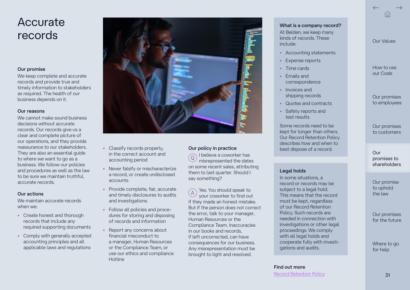 Accurate records Our promise We keep complete and accurate records and provide true and timely information to stakeholders as required. The health of our business depends on it. Our reasons We cannot make sound business decisions without accurate records. Our records give us a clear and complete picture of our operations, and they provide reassurance to our stakeholders. They are also an essential guide to where we want to go as a business. We follow our policies and procedures as well as the law to be sure we maintain truthful, accurate records. Our actions We maintain accurate records when we: • Create honest and thorough records that include any required supporting documents • Comply with generally accepted accounting principles and all applicable laws and regulations • Classify records properly, in the correct account and accounting period • Never falsify or mischaracterize a record, or create undisclosed accounts • Provide complete, fair, accurate and timely disclosures to audits and investigations • Follow all policies and proce- dures for storing and disposing of records and information • Report any concerns about financial misconduct to a manager, Human Resources or the Compliance Team, or use our ethics and compliance Hotline Our policy in practice Q I believe a coworker has misrepresented the dates on some recent sales, attributing them to last quarter. Should I say something? A Yes. You should speak to your coworker to find out if they made an honest mistake. But if the person does not correct the error, talk to your manager, Human Resources or the Compliance Team. Inaccuracies in our books and records, if left uncorrected, can have consequences for our business. Any misrepresentation must be brought to light and resolved. Find out more Record Retention Policy What is a company record? At Belden, we keep many kinds of records. These include: • Accounting statements • Expense reports • Time cards • Emails and correspondence • Invoices and shipping records • Quotes and contracts • Safety reports and test results Some records need to be kept for longer than others. Our Record Retention Policy describes how and when to best dispose of a record. Legal holds In some situations, a record or records may be subject to a legal hold. This means that the record must be kept, regardless of our Record Retention Policy. Such records are needed in connection with investigations or other legal proceedings. We comply with all legal holds and cooperate fully with investi- gations and audits. Our Values How to use our Code Our promises to employees Our promises to customers Our promise to uphold the law Our promises for the future Where to go for help 31 Our promises to shareholders