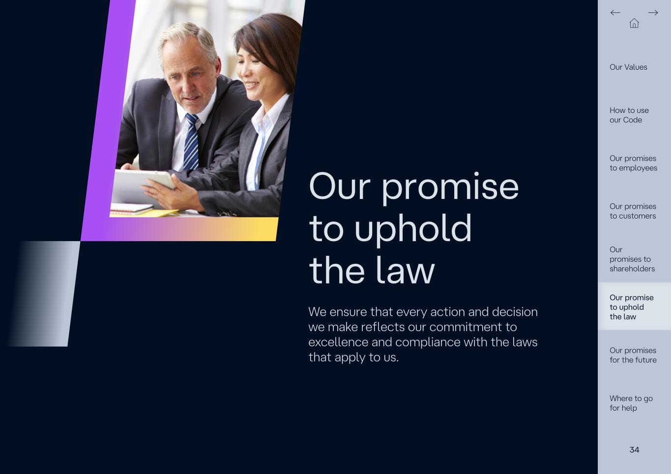 Our promise to uphold the law We ensure that every action and decision we make reflects our commitment to excellence and compliance with the laws that apply to us. Our Values How to use our Code Our promises to employees Our promises to customers Our promises to shareholders Our promise to uphold the law Our promises for the future Where to go for help 34 i