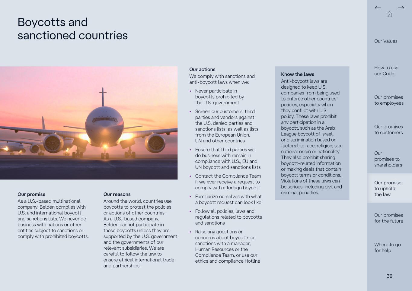 Boycotts and sanctioned countries Our promise As a U.S.-based multinational company, Belden complies with U.S. and international boycott and sanctions lists. We never do business with nations or other entities subject to sanctions or comply with prohibited boycotts. Our reasons Around the world, countries use boycotts to protest the policies or actions of other countries. As a U.S.-based company, Belden cannot participate in these boycotts unless they are supported by the U.S. government and the governments of our relevant subsidiaries. We are careful to follow the law to ensure ethical international trade and partnerships. Our actions We comply with sanctions and anti-boycott laws when we: • Never participate in boycotts prohibited by the U.S. government • Screen our customers, third parties and vendors against the U.S. denied parties and sanctions lists, as well as lists from the European Union, UN and other countries • Ensure that third parties we do business with remain in compliance with U.S., EU and UN boycott and sanctions lists • Contact the Compliance Team if we ever receive a request to comply with a foreign boycott • Familiarize ourselves with what a boycott request can look like • Follow all policies, laws and regulations related to boycotts and sanctions • Raise any questions or concerns about boycotts or sanctions with a manager, Human Resources or the Compliance Team, or use our ethics and compliance Hotline Know the laws Anti-boycott laws are designed to keep U.S. companies from being used to enforce other countries’ policies, especially when they conflict with U.S. policy. These laws prohibit any participation in a boycott, such as the Arab League boycott of Israel, or discrimination based on factors like race, religion, sex, national origin or nationality. They also prohibit sharing boycott-related information or making deals that contain boycott terms or conditions. Violations of these laws can be serious, including civil and criminal penalties. Our Values How to use our Code Our promises to employees Our promises to customers Our promises to shareholders Our promises for the future Where to go for help 38 Our promise to uphold the law