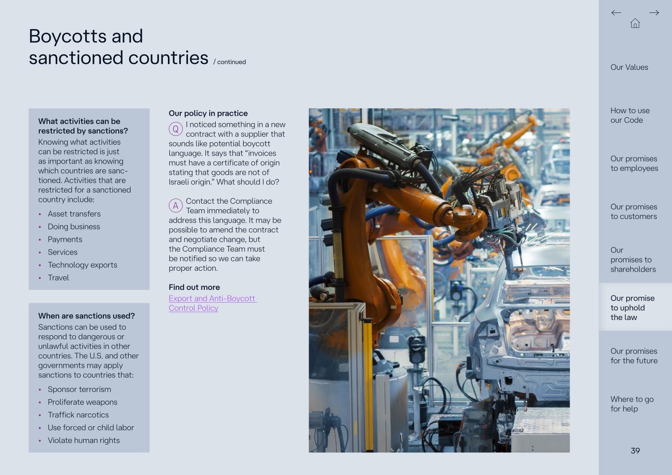 What activities can be restricted by sanctions? Knowing what activities can be restricted is just as important as knowing which countries are sanc- tioned. Activities that are restricted for a sanctioned country include: • Asset transfers • Doing business • Payments • Services • Technology exports • Travel When are sanctions used? Sanctions can be used to respond to dangerous or unlawful activities in other countries. The U.S. and other governments may apply sanctions to countries that: • Sponsor terrorism • Proliferate weapons • Traffick narcotics • Use forced or child labor • Violate human rights Our policy in practice Q I noticed something in a new contract with a supplier that sounds like potential boycott language. It says that “invoices must have a certificate of origin stating that goods are not of Israeli origin.” What should I do? A Contact the Compliance Team immediately to address this language. It may be possible to amend the contract and negotiate change, but the Compliance Team must be notified so we can take proper action. Find out more Export and Anti-Boycott Control Policy Boycotts and sanctioned countries / continued Our Values How to use our Code Our promises to employees Our promises to customers Our promises to shareholders Our promises for the future Where to go for help 39 Our promise to uphold the law