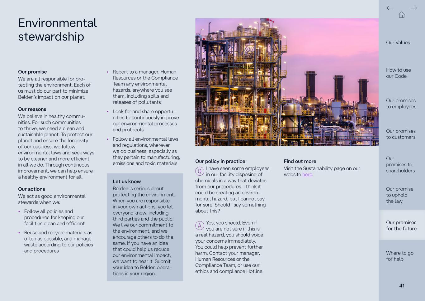 Environmental stewardship Our promise We are all responsible for pro- tecting the environment. Each of us must do our part to minimize Belden’s impact on our planet. Our reasons We believe in healthy commu- nities. For such communities to thrive, we need a clean and sustainable planet. To protect our planet and ensure the longevity of our business, we follow environmental laws and seek ways to be cleaner and more efficient in all we do. Through continuous improvement, we can help ensure a healthy environment for all. Our actions We act as good environmental stewards when we: • Follow all policies and procedures for keeping our facilities clean and efficient • Reuse and recycle materials as often as possible, and manage waste according to our policies and procedures • Report to a manager, Human Resources or the Compliance Team any environmental hazards, anywhere you see them, including spills and releases of pollutants • Look for and share opportu- nities to continuously improve our environmental processes and protocols • Follow all environmental laws and regulations, wherever we do business, especially as they pertain to manufacturing, emissions and toxic materials Let us know Belden is serious about protecting the environment. When you are responsible in your own actions, you let everyone know, including third parties and the public. We live our commitment to the environment, and we encourage others to do the same. If you have an idea that could help us reduce our environmental impact, we want to hear it. Submit your idea to Belden opera- tions in your region. Our policy in practice Q I have seen some employees in our facility disposing of chemicals in a way that deviates from our procedures. I think it could be creating an environ- mental hazard, but I cannot say for sure. Should I say something about this? A Yes, you should. Even if you are not sure if this is a real hazard, you should voice your concerns immediately. You could help prevent further harm. Contact your manager, Human Resources or the Compliance Team, or use our ethics and compliance Hotline. Find out more Visit the Sustainability page on our website here. Our Values How to use our Code Our promises to employees Our promises to customers Our promises to shareholders Our promise to uphold the law Where to go for help 41 Our promises for the future