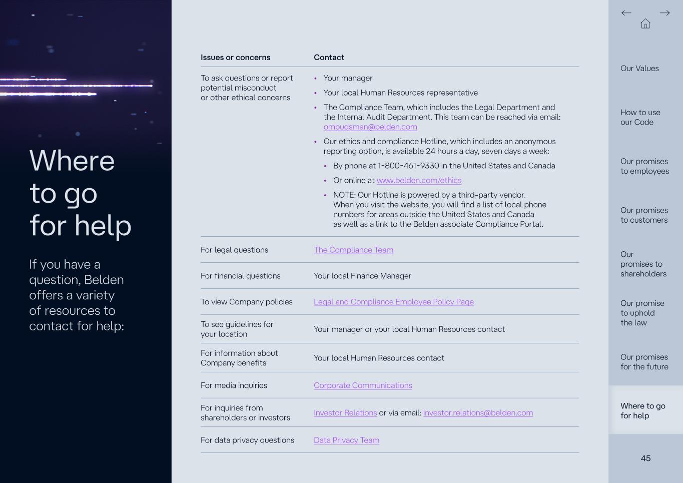 Issues or concerns Contact To ask questions or report potential misconduct or other ethical concerns • Your manager • Your local Human Resources representative • The Compliance Team, which includes the Legal Department and the Internal Audit Department. This team can be reached via email: ombudsman@belden.com • Our ethics and compliance Hotline, which includes an anonymous reporting option, is available 24 hours a day, seven days a week: • By phone at 1-800-461-9330 in the United States and Canada • Or online at www.belden.com/ethics • NOTE: Our Hotline is powered by a third-party vendor. When you visit the website, you will find a list of local phone numbers for areas outside the United States and Canada as well as a link to the Belden associate Compliance Portal. For legal questions The Compliance Team For financial questions Your local Finance Manager To view Company policies Legal and Compliance Employee Policy Page To see guidelines for your location Your manager or your local Human Resources contact For information about Company benefits Your local Human Resources contact For media inquiries Corporate Communications For inquiries from shareholders or investors Investor Relations or via email: investor.relations@belden.com For data privacy questions Data Privacy Team Where to go for help If you have a question, Belden offers a variety of resources to contact for help: Our Values How to use our Code Our promises to employees Our promises to customers Our promises to shareholders Our promise to uphold the law Our promises for the future 45 Where to go for help