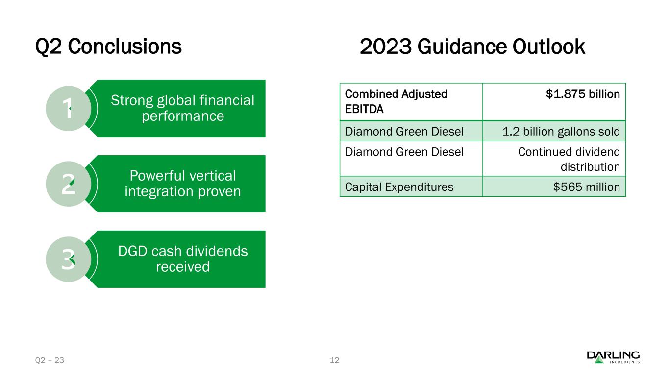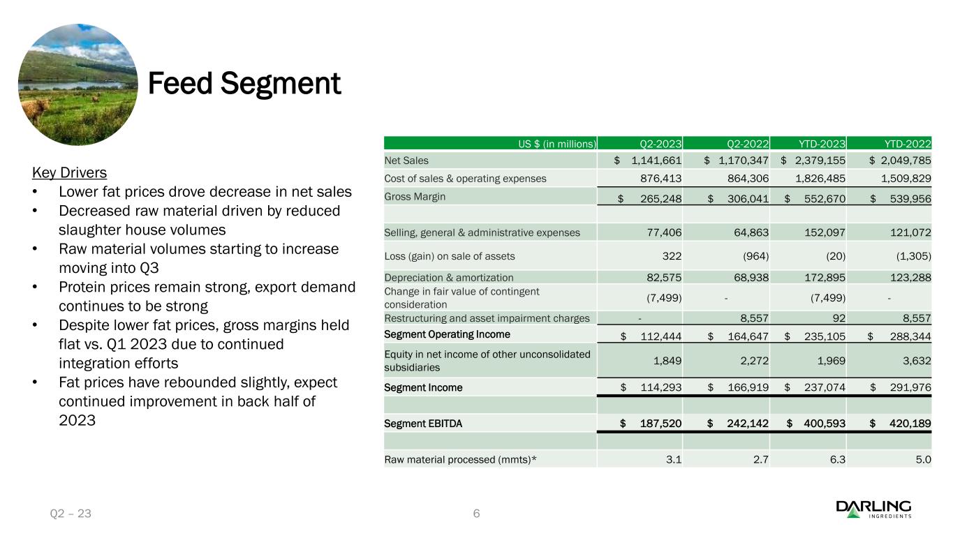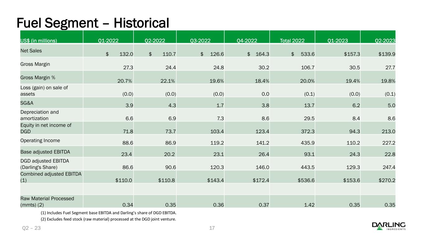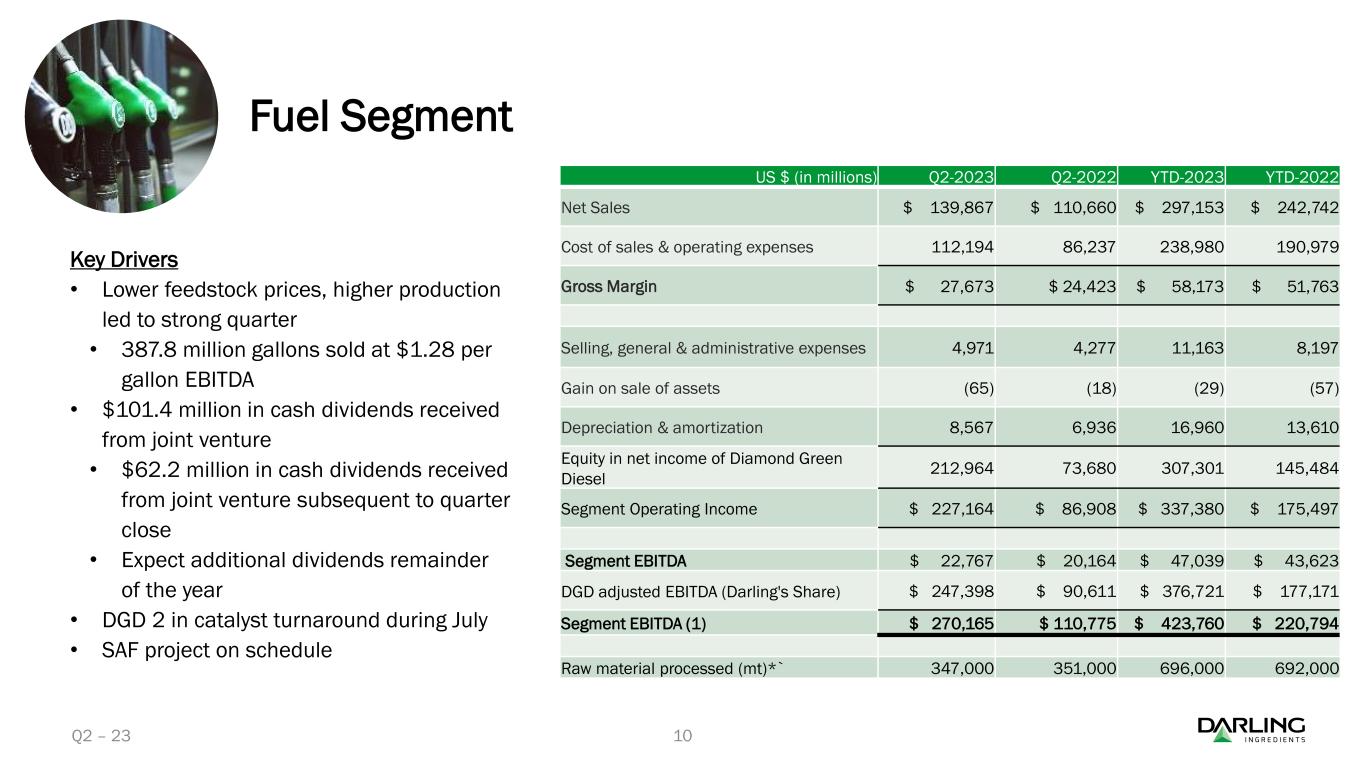 ダイヤモンド・グリーン・ディーゼル(DGD)は、2023年第2四半期に再生可能ディーゼルを過去最高の3億8,780万ガロン(EBITDA平均1ガロン当たり1.28ドル)で販売した。累計では、DGDは6億4,330万ガロンの再生可能ディーゼルを販売し、平均EBITDAは1ガロン当たり1.17ドルであった。第2四半期中、Darling Ingredientsは合弁会社から1億140万ドルの現金配当を受け取った。四半期終了後、Darling Ingredientsは合弁会社からさらに6,220万ドルの現金配当を受け取った。