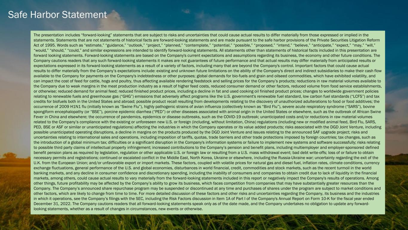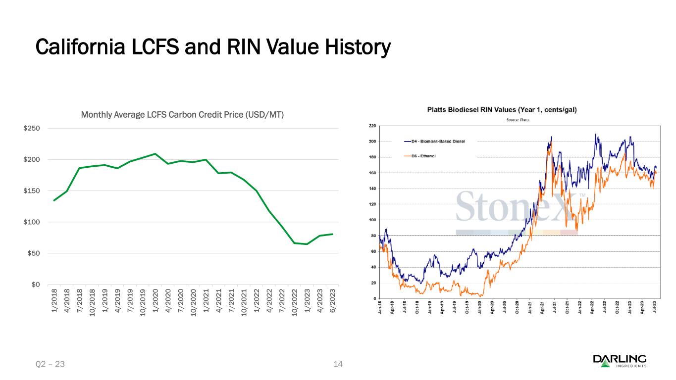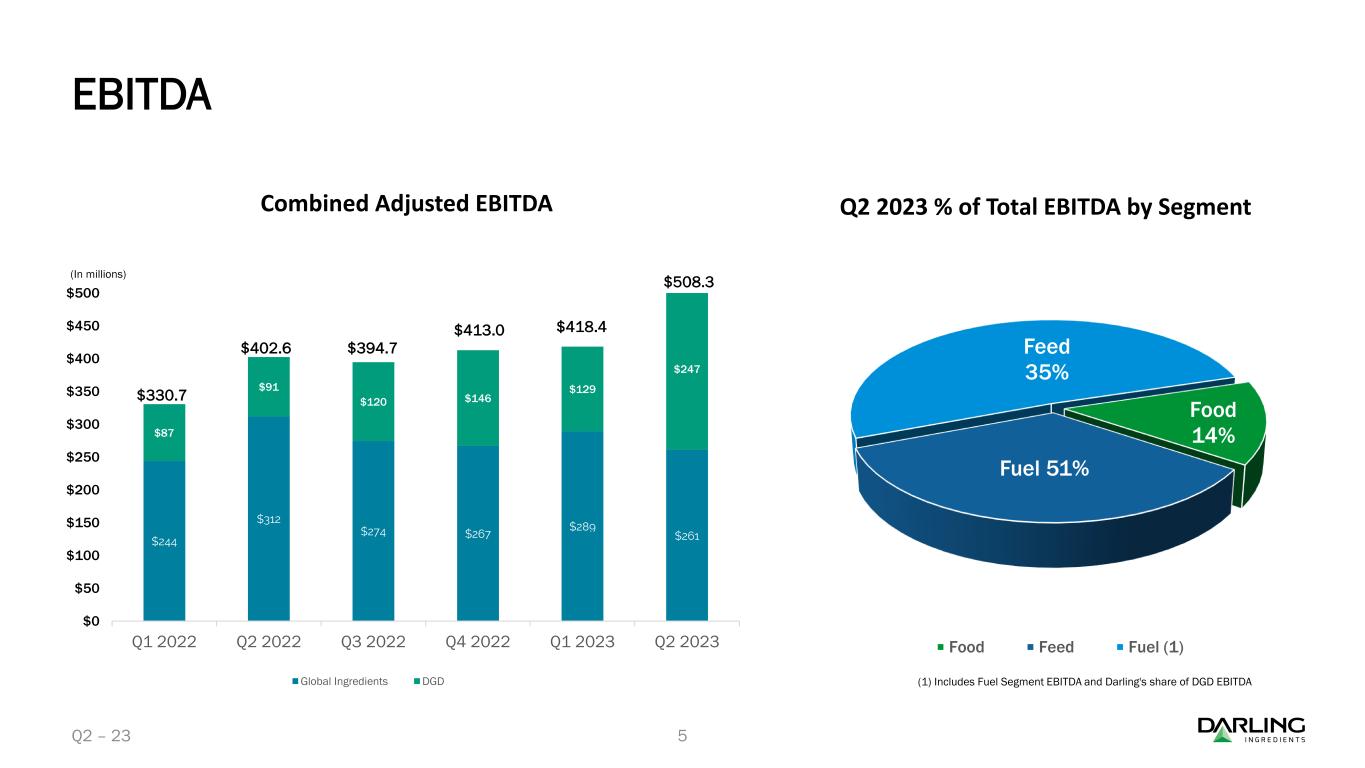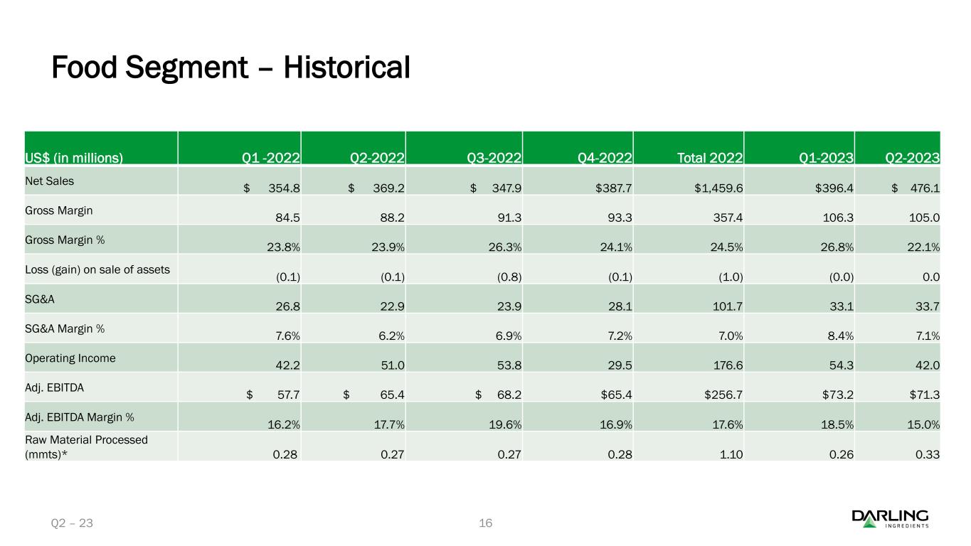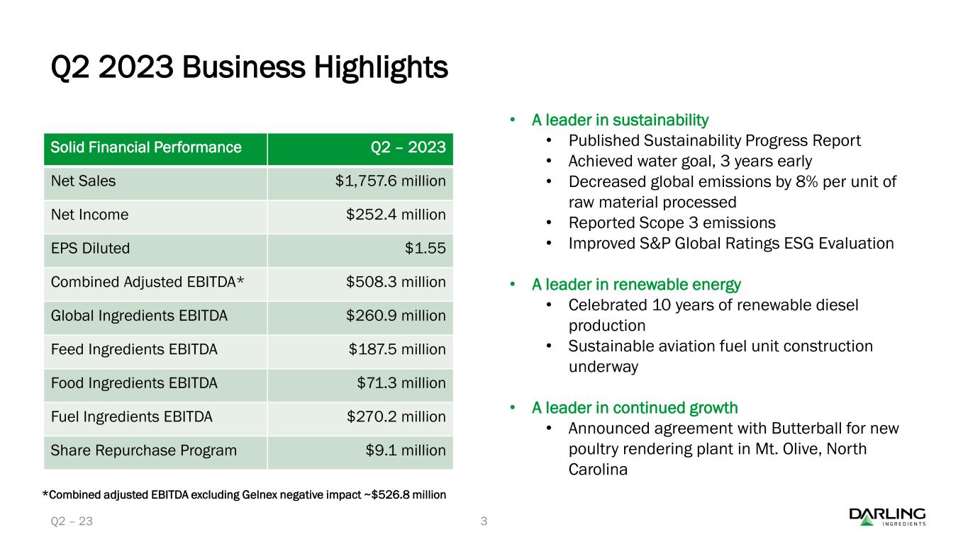 ダイヤモンド・グリーン・ディーゼル(DGD)は、2023年第2四半期に再生可能ディーゼルを過去最高の3億8,780万ガロン(EBITDA平均1ガロン当たり1.28ドル)で販売した。累計では、DGDは6億4,330万ガロンの再生可能ディーゼルを販売し、平均EBITDAは1ガロン当たり1.17ドルであった。第2四半期中、Darling Ingredientsは合弁会社から1億140万ドルの現金配当を受け取った。四半期終了後、Darling Ingredientsは合弁会社からさらに6,220万ドルの現金配当を受け取った。