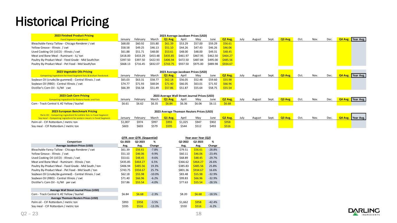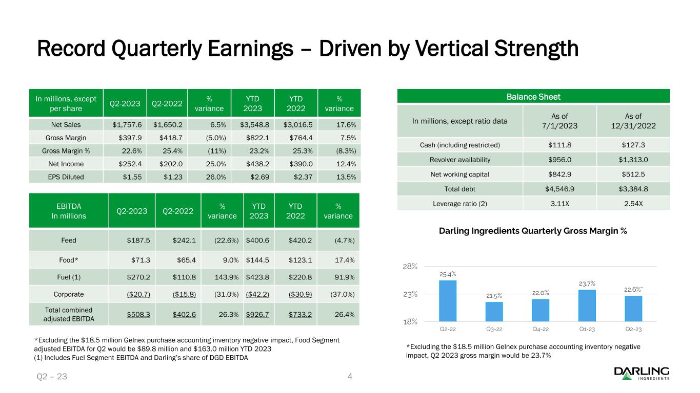 テキサス州アーヴィング - ダーリング・インジェリジェンツ・インク(NYSE: DAR)は本日、2023年第2四半期の純利益が2億5,240万ドル(希薄化後1株当たり1.55ドル)となり、これに対し2022年第2四半期の純利益は2億200万ドル(希薄化後1株当たり1.23ドル)となったと発表した。また、2023年第2四半期の純売上高は18億ドル(前年同期は17億ドル)となった。