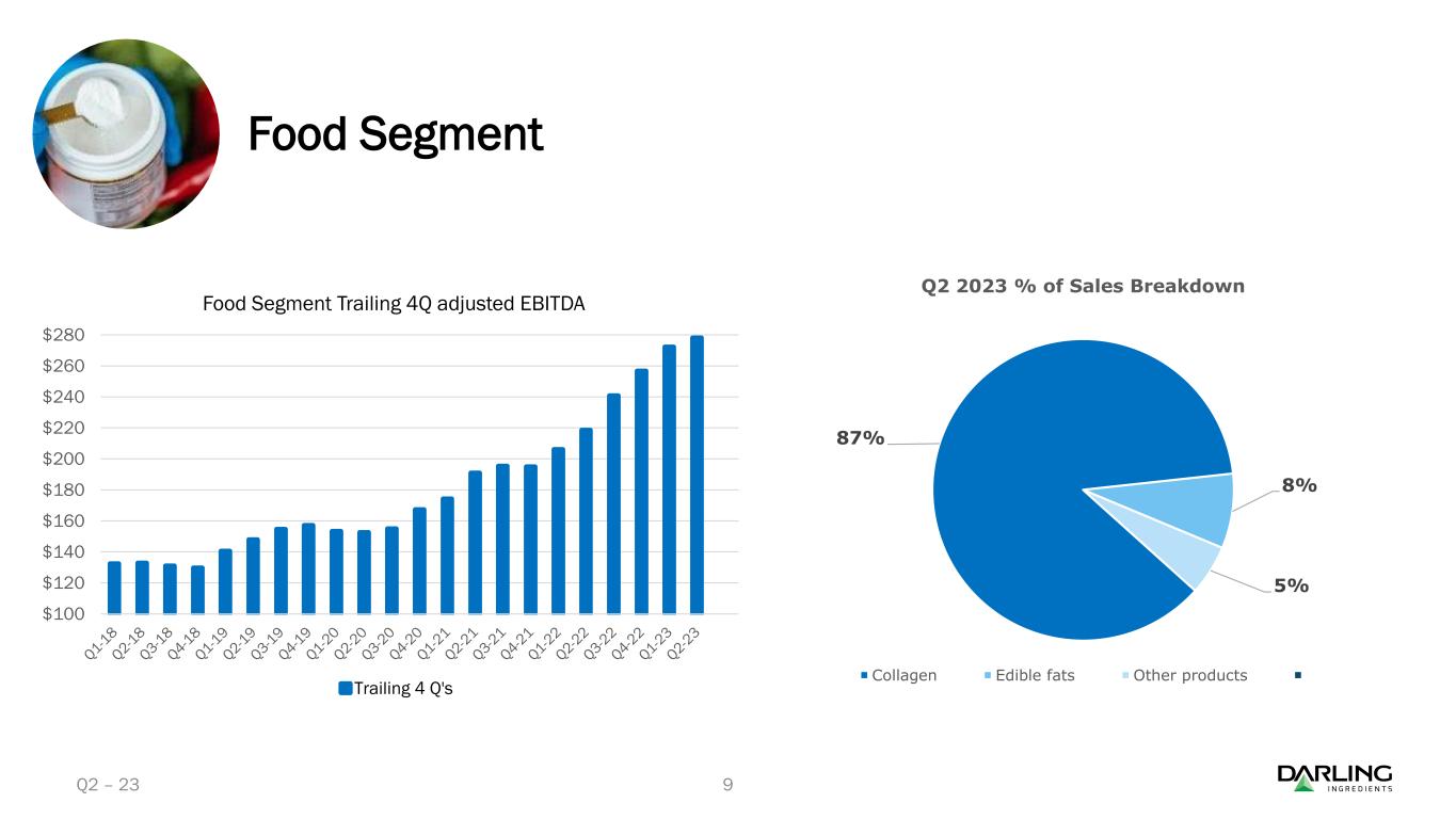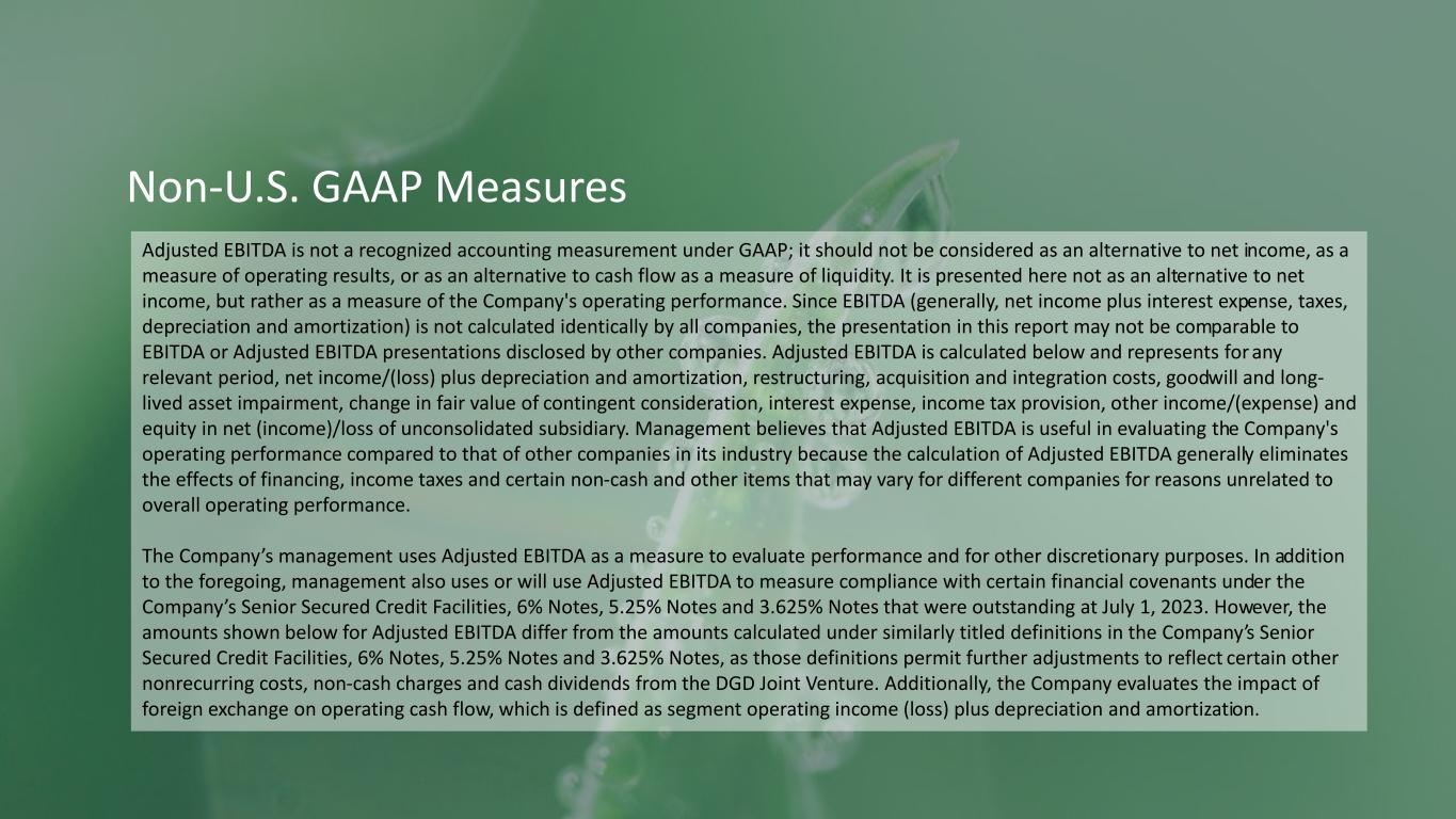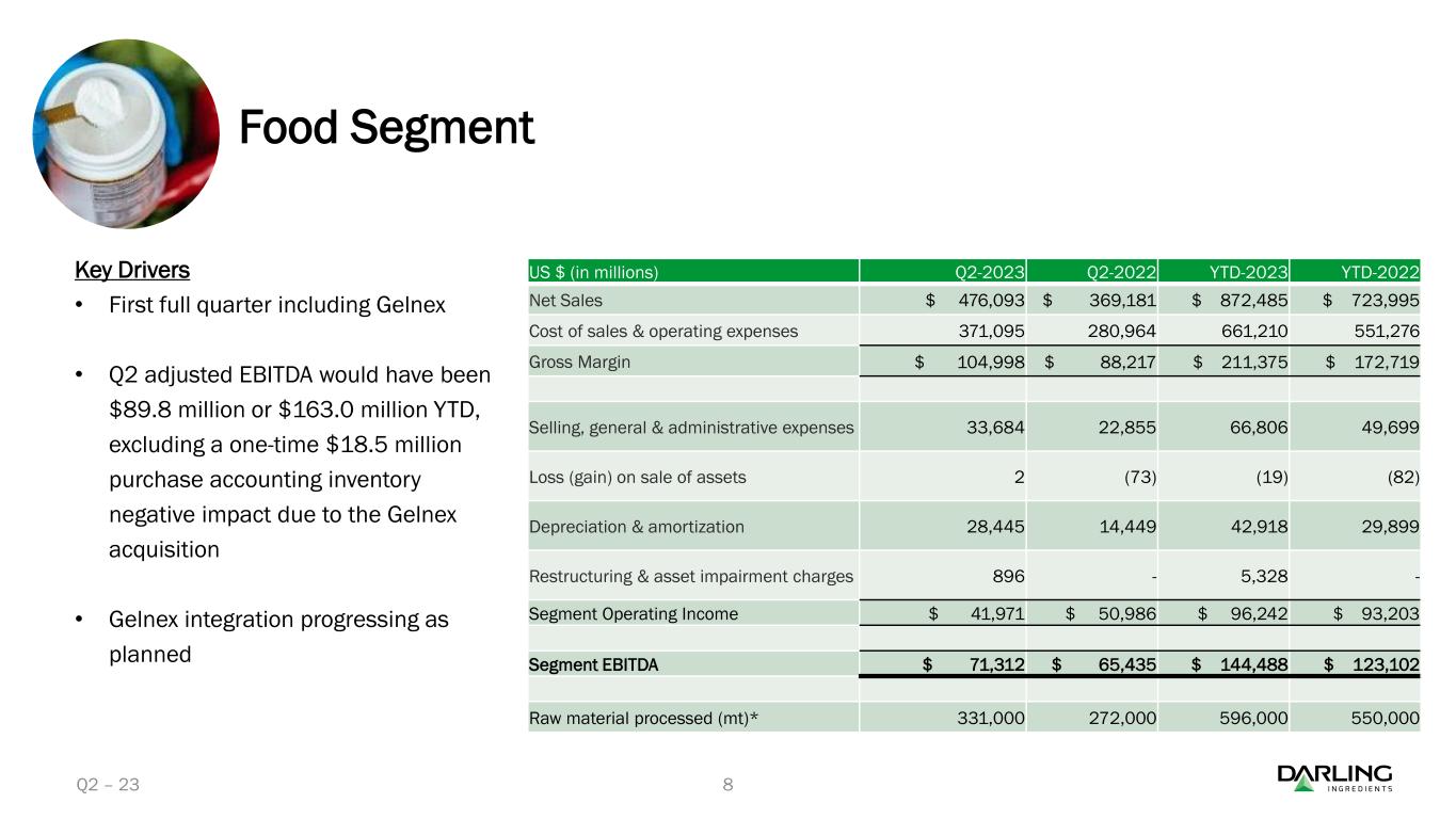2023年第2四半期の調整後EBITDAの合計は5億830万ドルで、これに対して2022年同期は4億260万ドルであった。累計では、調整後EBITDAの合計は9億2,670万ドル(前年同期は7億3,320万ドル)であった。ゲルネックスの買収による食品セグメントでの1,850万ドルの一時的なパーチェス会計による在庫のマイナス影響を除くと、2023年第2四半期の調整後EBITDAは5億2,680万ドルとなる。