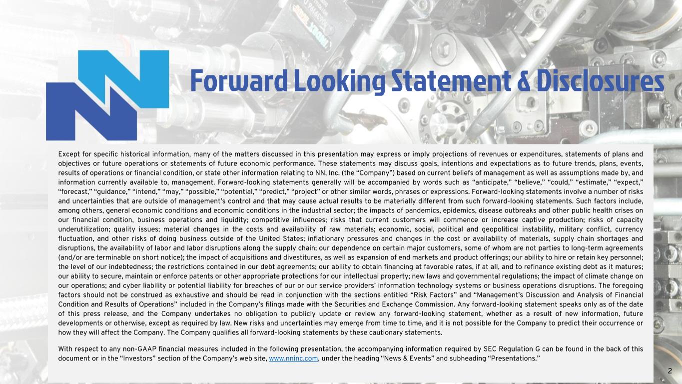 Except for specific historical information, many of the matters discussed in this press release may express or imply projections of revenues or expenditures, statements of plans and objectives or future operations or statements of future economic performance. These statements may discuss goals, intentions and expectations as to future trends, plans, events, results of operations or financial condition, or state other information relating to NN, Inc. (the “Company”) based on current beliefs of management as well as assumptions made by, and information currently available to, management. Forward-looking statements generally will be accompanied by words such as “anticipate,” “believe,” “could,” “estimate,” “expect,” “forecast,” “guidance,” “intend,” “may,” “possible,” “potential,” “predict,” “project” or other similar words, phrases or expressions. Forward-looking statements involve a number of risks and uncertainties that are outside of management’s control and that may cause actual results to be materially different from such forward-looking statements. Such factors include, among others, general economic conditions and economic conditions in the industrial sector; the impacts of pandemics, epidemics, disease outbreaks and other public health crises on our financial condition, business operations and liquidity; competitive influences; risks that current customers will commence or increase captive production; risks of capacity underutilization; quality issues; material changes in the costs and availability of raw materials; economic, social, political and geopolitical instability, military conflict, currency fluctuation, and other risks of doing business outside of the United States; inflationary pressures and changes in the cost or availability of materials, supply chain shortages and disruptions, the availability of labor and labor disruptions along the supply chain; our dependence on certain major customers, some of whom are not parties to long-term agreements (and/or are terminable on short notice); the impact of acquisitions and divestitures, as well as expansion of end markets and product offerings; our ability to hire or retain key personnel; the level of our indebtedness; the restrictions contained in our debt agreements; our ability to obtain financing at favorable rates, if at all, and to refinance existing debt as it matures; our ability to secure, maintain or enforce patents or other appropriate protections for our intellectual property; new laws and governmental regulations; the impact of climate change on our operations; and cyber liability or potential liability for breaches of our or our service providers’ information technology systems or business operations disruptions. The foregoing factors should not be construed as exhaustive and should be read in conjunction with the sections entitled “Risk Factors” and “Management’s Discussion and Analysis of Financial Condition and Results of Operations” included in the Company’s filings made with the Securities and Exchange Commission. Any forward-looking statement speaks only as of the date of this press release, and the Company undertakes no obligation to publicly update or review any forward-looking statement, whether as a result of new information, future developments or otherwise, except as required by law. New risks and uncertainties may emerge from time to time, and it is not possible for the Company to predict their occurrence or how they will affect the Company. The Company qualifies all forward-looking statements by these cautionary statements.