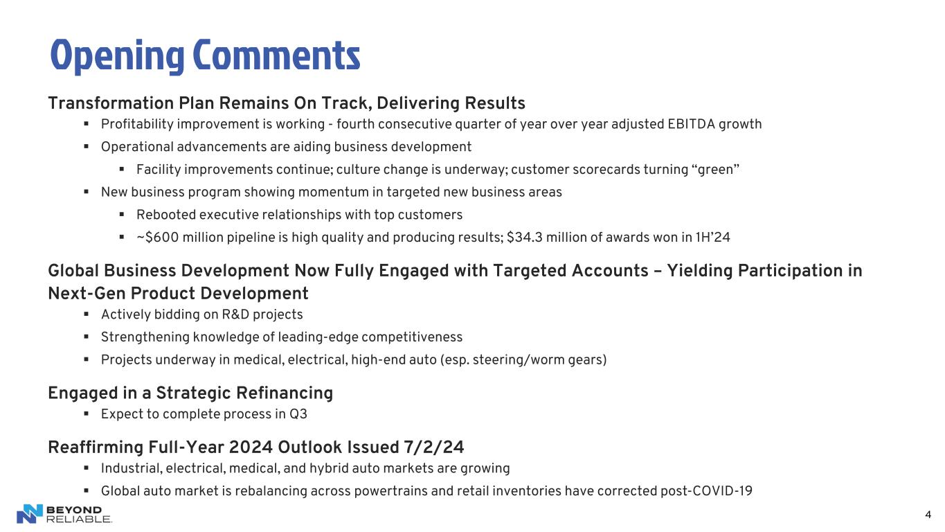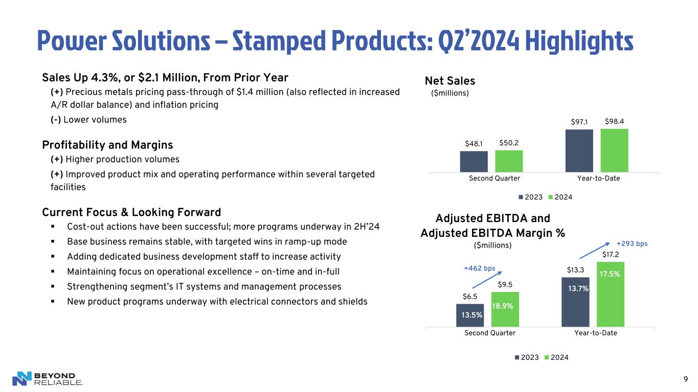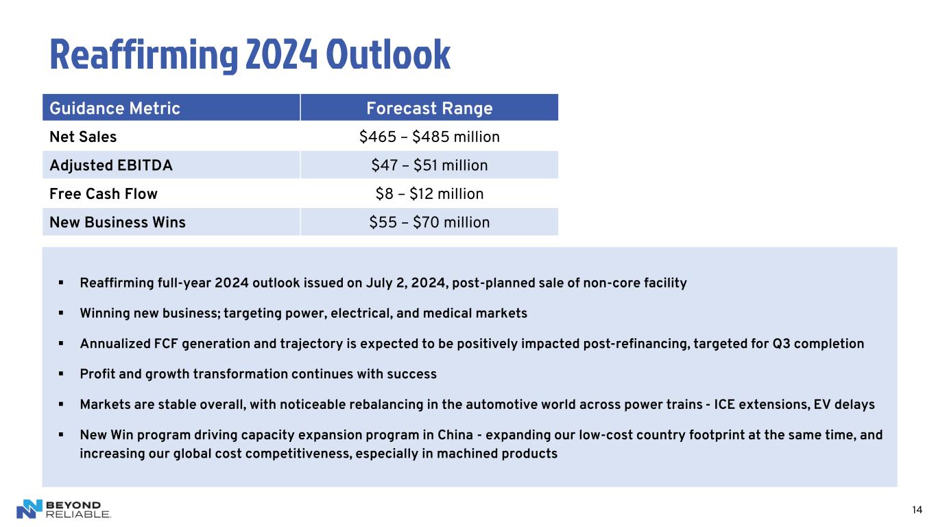 Mr. Bevis continued, “We continue to see strong momentum in our commercial efforts as we have won nearly $18 million of new business awards in the second quarter and $97 million over the last six quarters. We are on pace to deliver our 2024 targets for new business wins. The electrical, industrial, and medical markets remain unchanged, healthy, and growing. However, the global auto market is recalibrating the choices of powertrain and low-cost country production.”