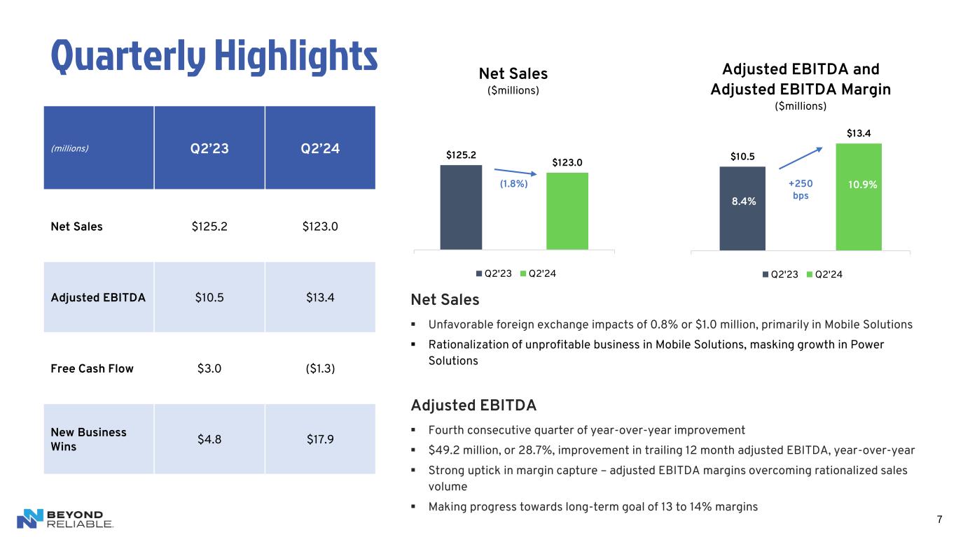 Adjusted income from operations for the second quarter of 2024 was $2.1 million compared to adjusted income from operations of $1.3 million for the same period in 2023. Adjusted EBITDA was $13.4 million, or 10.9% of sales, compared to $10.5 million, or 8.4% of sales, for the same period in 2023.