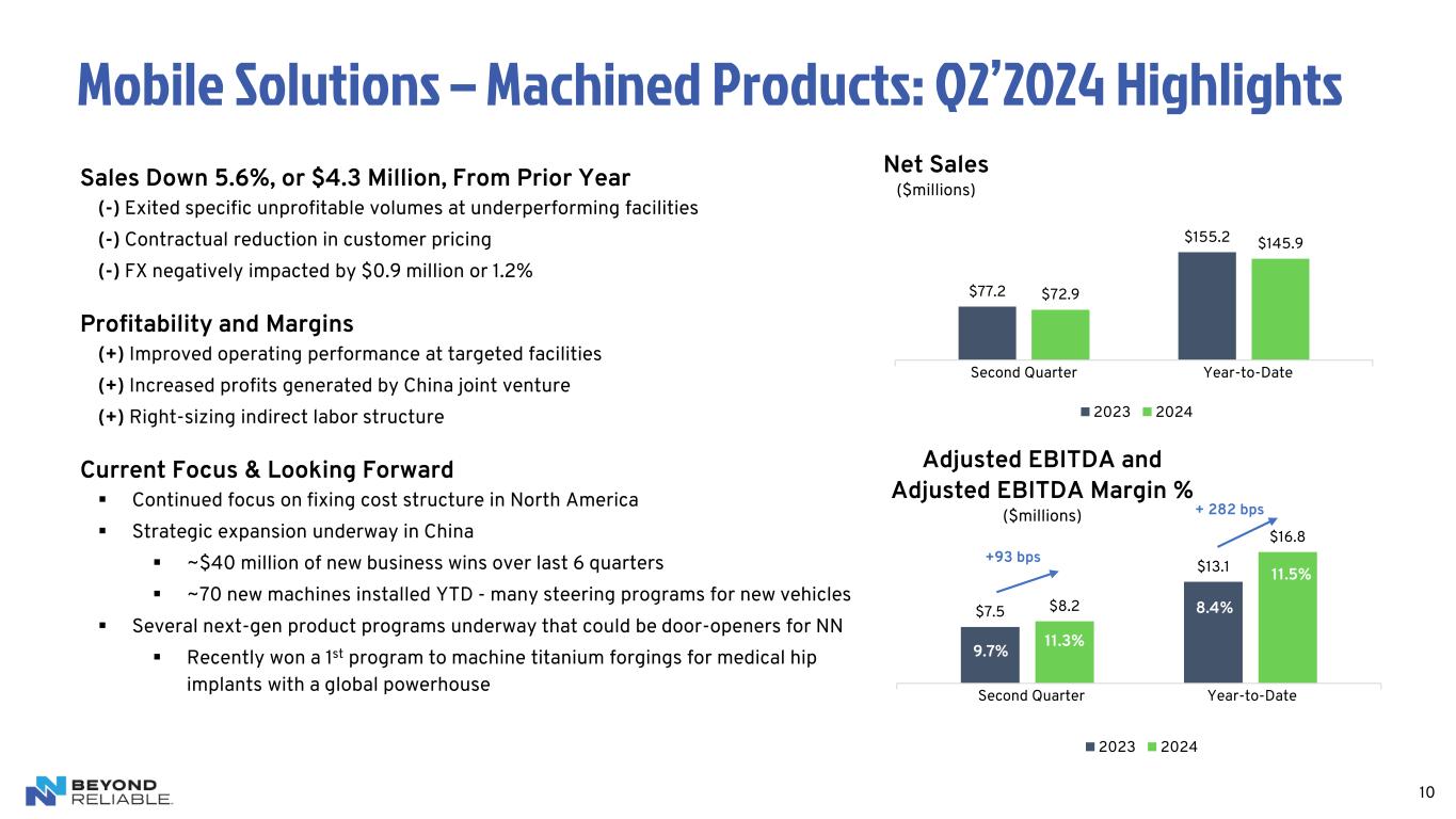 “NN delivered another quarter of improvement, driven by the execution of our strategic transformation plan which is yielding observable momentum across key focus areas of profitability enhancement, operational performance, and accelerated new business wins,” said Harold Bevis, President and Chief Executive Officer. “Our committed efforts to strengthen profitability were evident in the quarter, as our $13.4 million of adjusted EBITDA reflected solid growth over the prior year, which is the fourth consecutive quarter of year-over-year improvement. On a trailing-twelve-month basis we have delivered adjusted EBITDA of $49.2 million, an improvement of 28.7% year-over-year. Our focus on improved operating performance and productivity has helped drive solid margin expansion, advancing our profitability and overcoming the strategic rationalization of volumes which impacted our top-line. ”