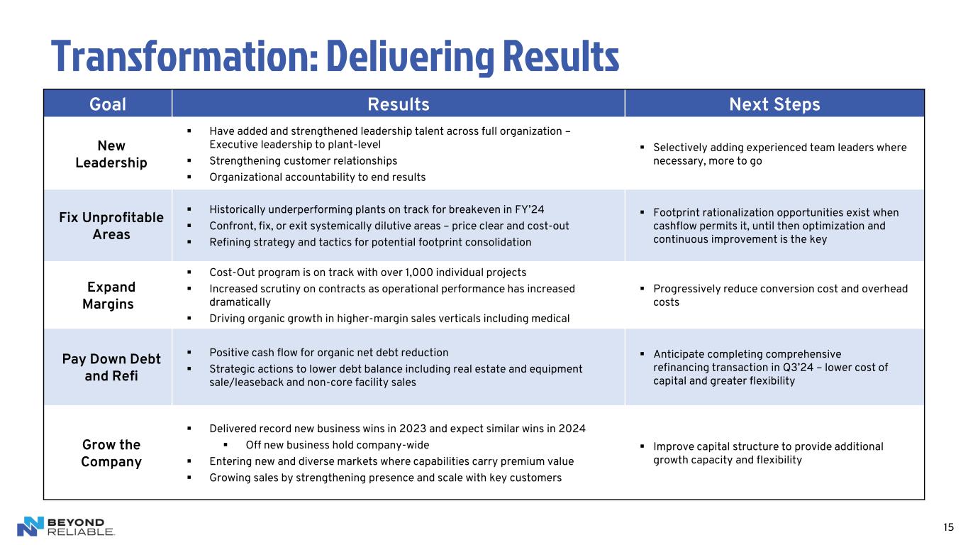 •Subsequent to quarter-end, the company executed the sale of its lone non-core plastics plant and used $15.4 million of proceeds to pay down debt.