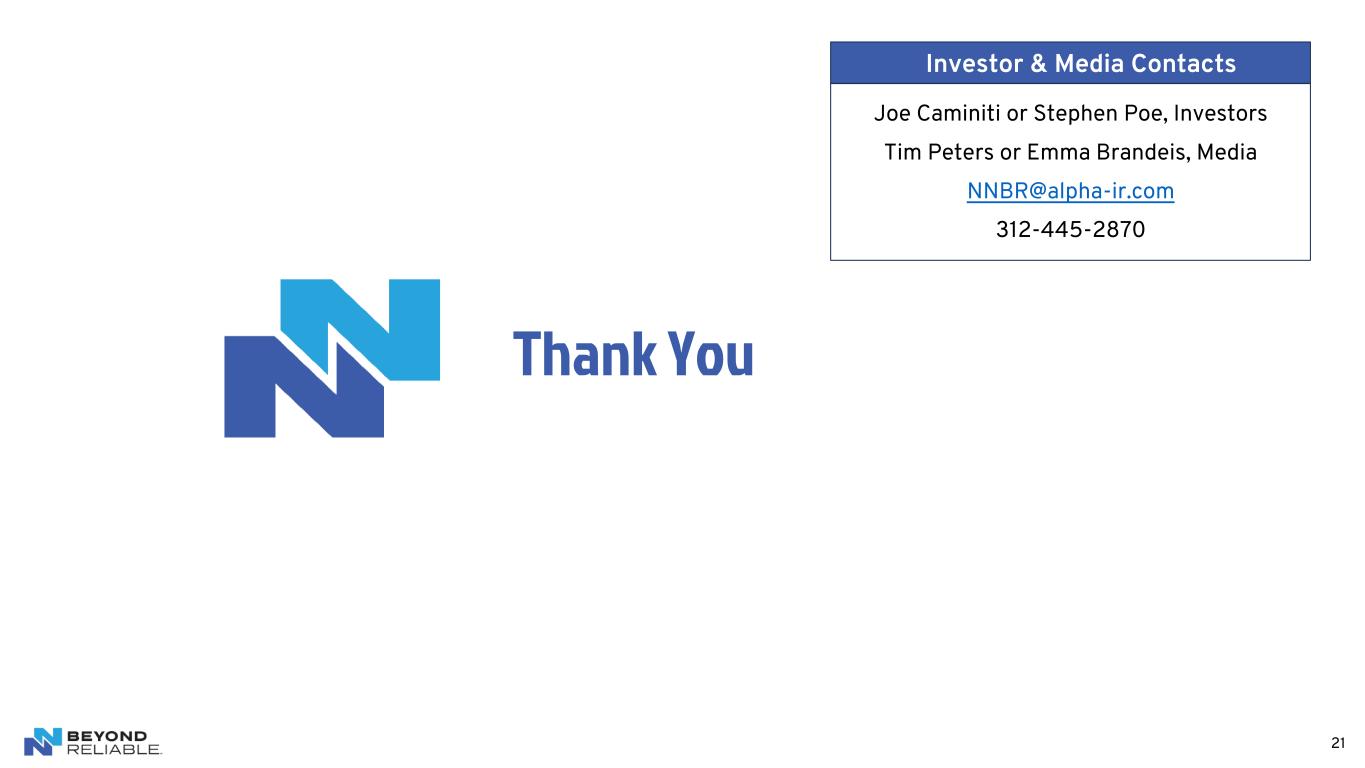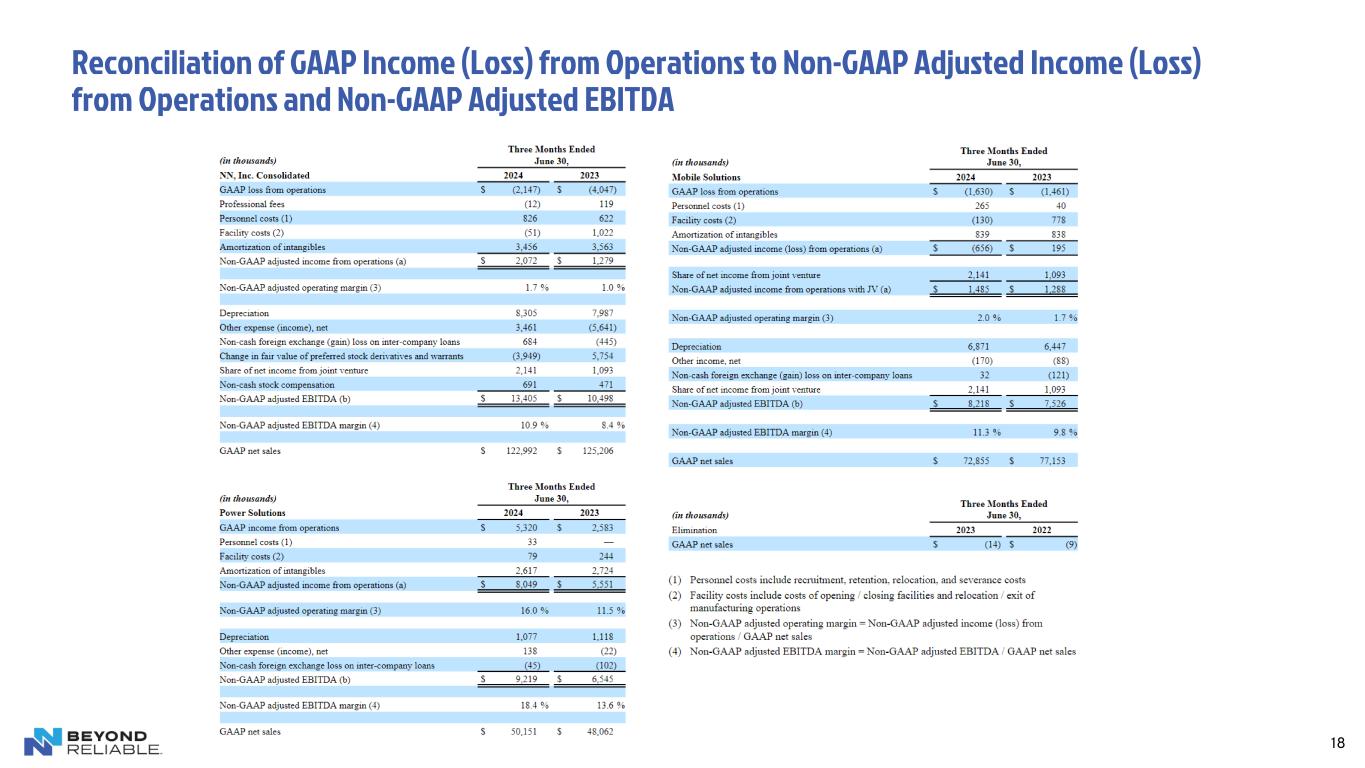 NN discloses in this press release the non-GAAP financial measures of adjusted income (loss) from operations, adjusted EBITDA, adjusted net income (loss), adjusted net income (loss) per diluted common share, and free cash flow. Each of these non-GAAP financial measures provides supplementary information about the impacts of restructuring and integration expense, acquisition and transition expenses, foreign exchange impacts on inter-company loans, amortization of intangibles and deferred financing costs, and other non-operating impacts on our business.