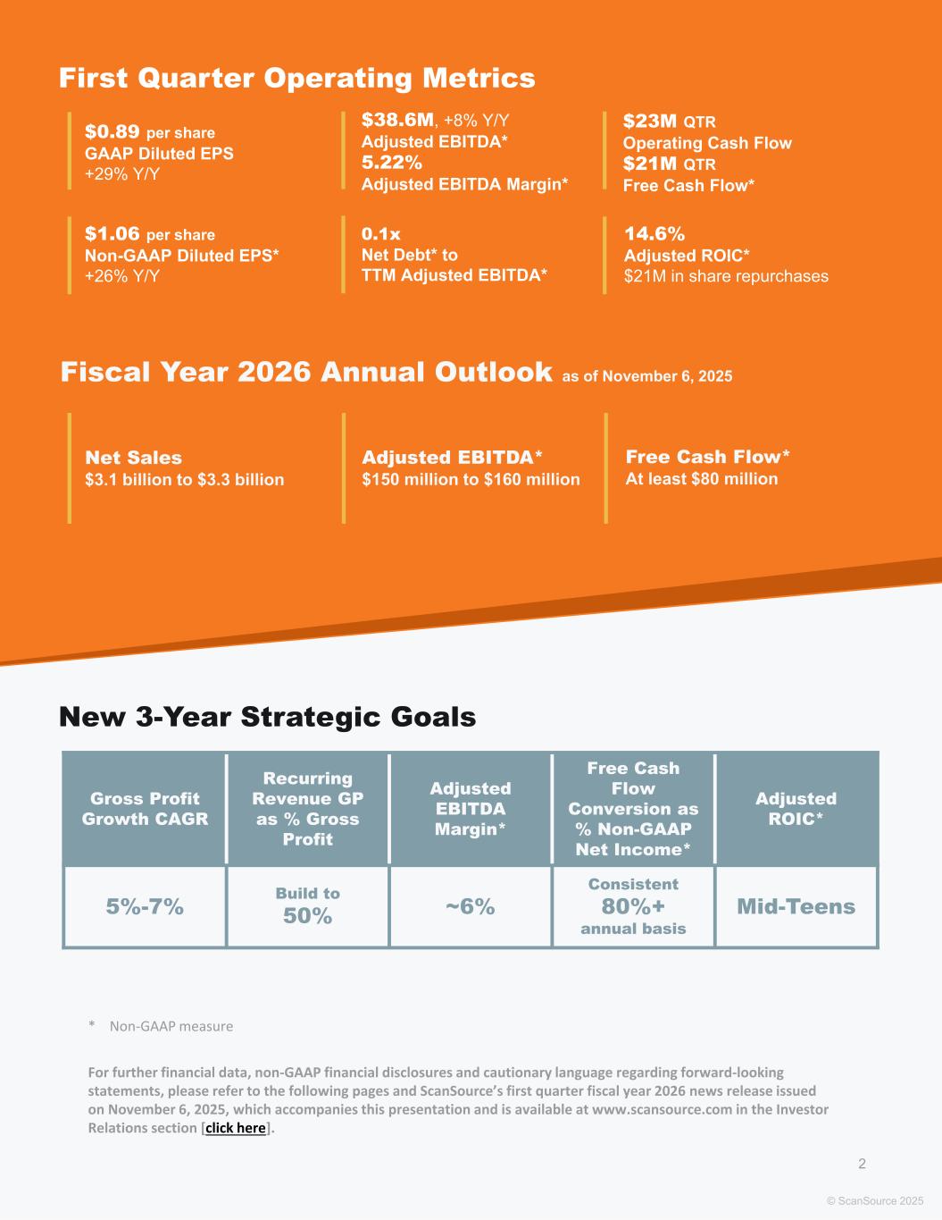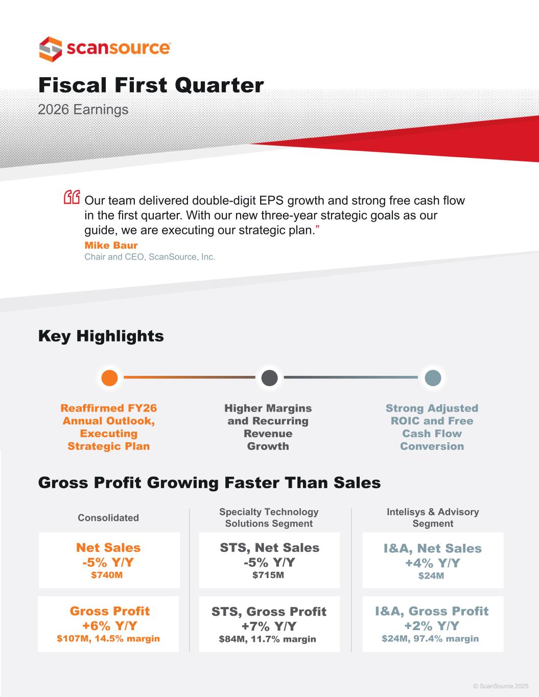 サウスカロライナ州グリーンビル -- 2025年11月6日 -- 複雑化・融合するテクノロジーに独自の立場で対応する大手テクノロジーディストリビューター、スキャンソース社(NASDAQ: SCSC)は本日、2025年9月30日に終了した第1四半期の業績を発表した。