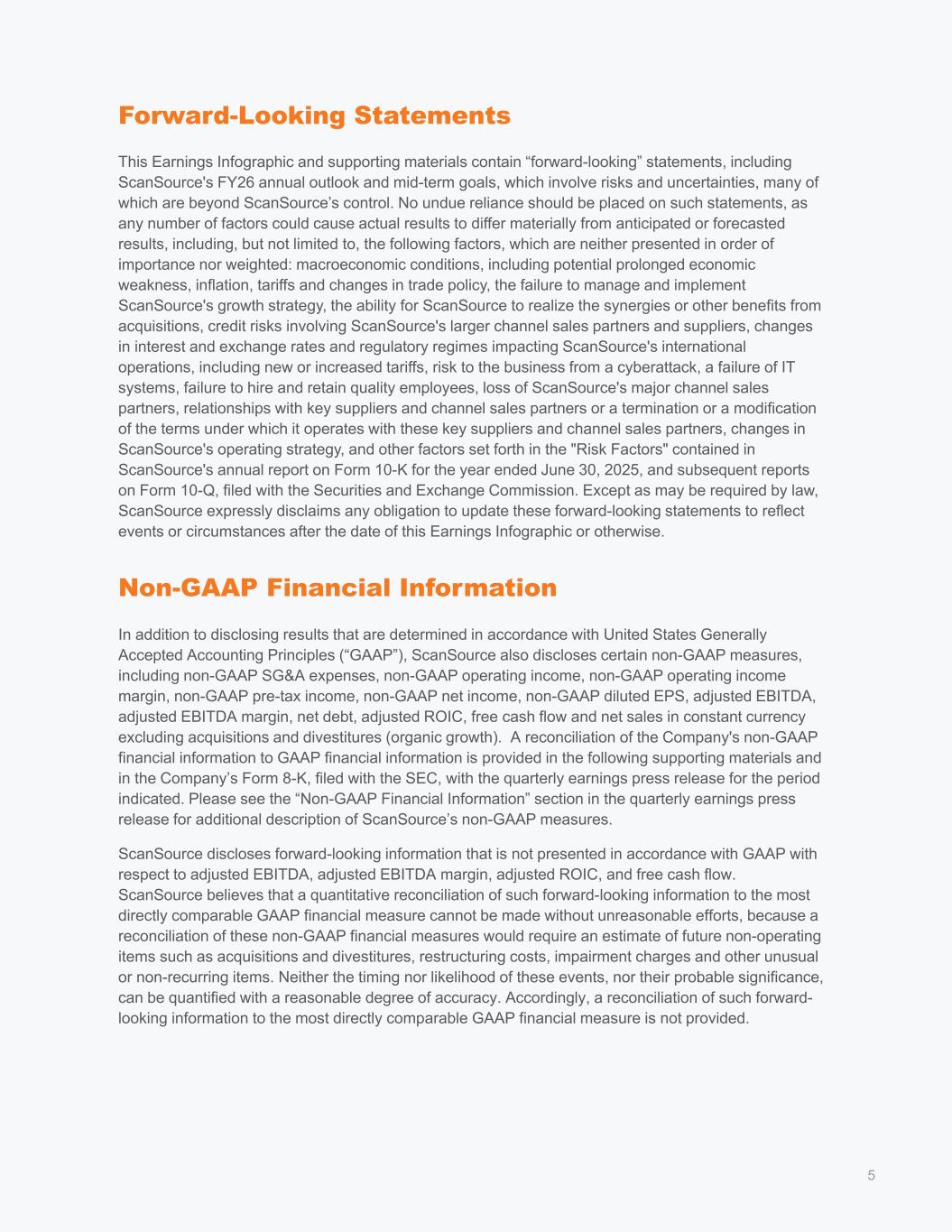 本プレスリリースには、ScanSourceのFY26年間見通しを含む「将来の見通し」に関する記述が含まれていますが、これらの記述にはリスクや不確実性が含まれており、その多くはScanSourceが制御できないものです。実際の業績は、様々な要因によって予想、見通しとは大きく異なる結果となりうるため、これらの記述に全面的に依拠されることは控えるようお願いします:潜在的な景気低迷の長期化、インフレ、関税および通商政策の変更を含むマクロ経済情勢、ScanSourceの成長戦略の管理および実行の失敗、ScanSourceが買収によるシナジー効果またはその他の利益を実現する能力、ScanSourceの大規模なチャネル販売パートナーおよびサプライヤーに関わる信用リスク、金利および為替レートの変動、新規または関税の引き上げを含むScanSourceの国際事業に影響を与える規制体制、サイバー攻撃による事業へのリスク、ITシステムの障害、質の高い従業員の雇用および維持の失敗、ScanSourceの主要なチャネル販売パートナーの喪失、主要なサプライヤーおよびチャネル販売パートナーとの関係、またはこれらの主要なサプライヤーおよびチャネル販売パートナーとの取引条件の終了または変更、ScanSourceの経営戦略の変更、および2025年6月30日に終了した年度のScanSourceのフォーム10-K年次報告書に記載されている「リスク要因」に記載されているその他の要因。
