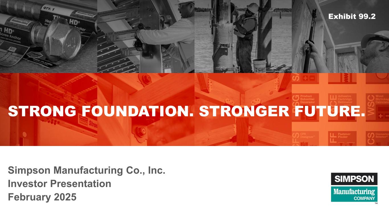 カリフォルニア州プレザントン - 2025 年 2 月 10 日:シンプソン・マニュファクチャリング社(以下「当社」)(NYSE:SSD)は本日、構造用コネクターおよび建築ソリューションの業界リーダーとして、2024年度第4四半期および通期の業績を発表しました。以下の比較(一般的に「増加」、「減少」、「維持」、「比較」などの言葉で示される)は、特に断りのない限り、2024年12月31日に終了した四半期と2023年12月31日に終了した四半期、または2024年12月31日に終了した会計年度と2023年12月31日に終了した会計年度の比較です。