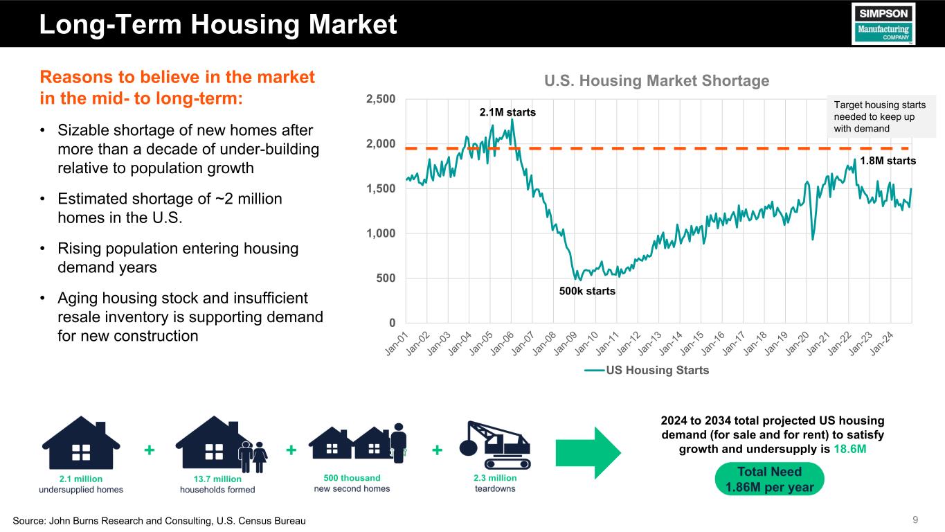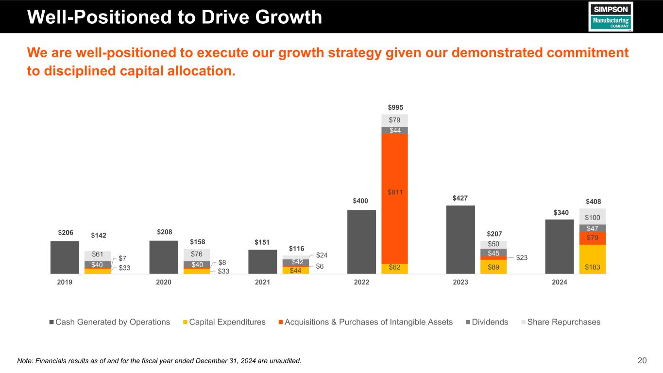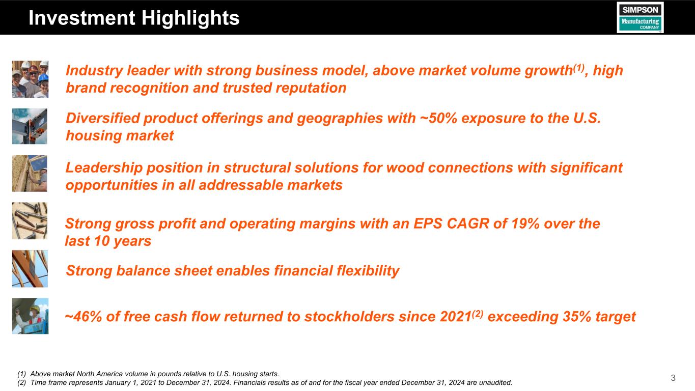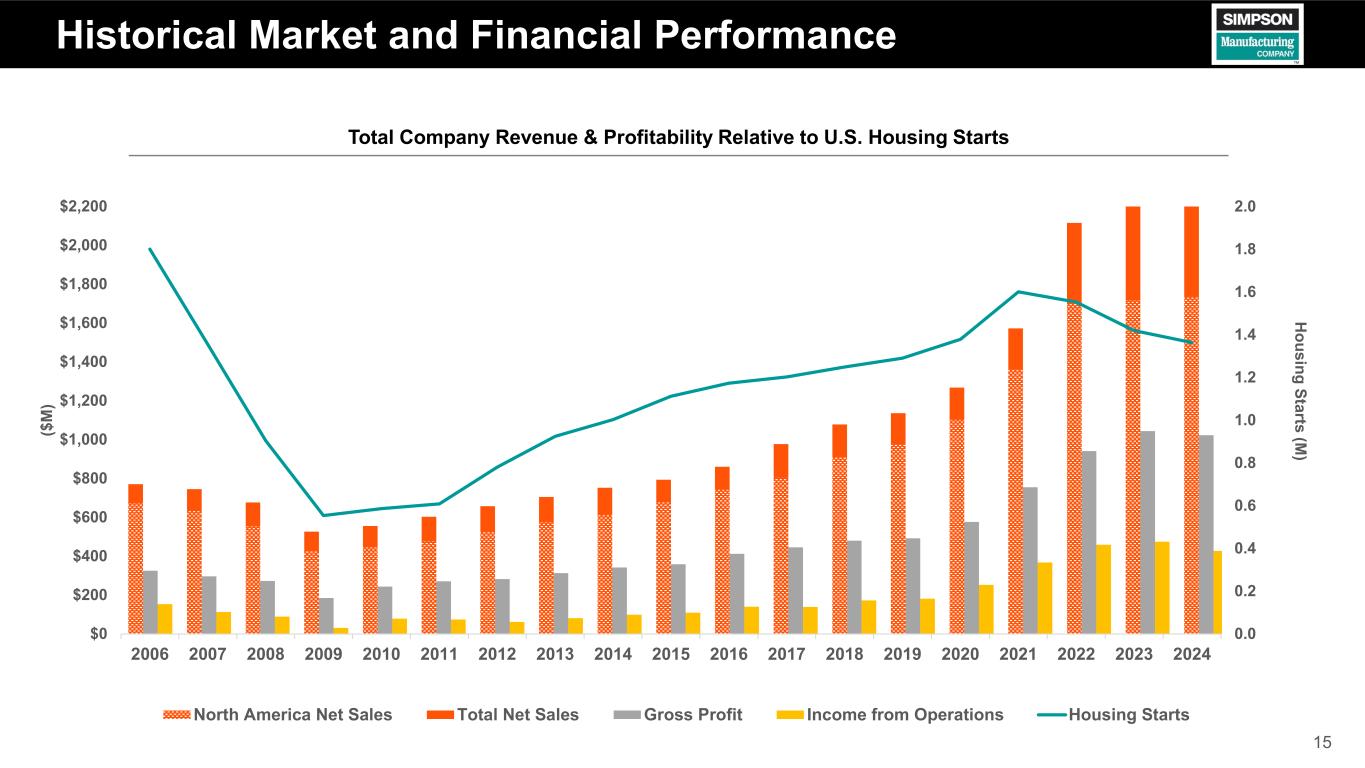 2025年には、米国の住宅着工戸数は1桁台前半の回復が可能であり、欧州の住宅着工戸数は2024年の水準と同水準になると考えています。株主還元を最大化するためのコミットメントの一環として、当社は、12ヵ月後累計ベースで米国住宅着工件数の市場成長率を上回る成長を継続し、営業利益率を20%以上に維持し、純収入の伸びを上回るEPSの伸びを推進するという財務目標を修正しました。営業利益率については、2025年のガイダンス・レンジの中間値は当社の目標を下回っていますが、当社は過去3年間の大幅な投入コスト上昇を相殺すべく取り組んでおり、収益性を維持するための手段を慎重に検討していきます。当社の事業は、市場が緩やかに成長し、市場以上の数量成長が続けば、営業利益率20%以上を達成できると考えている。私たちは、住宅市場の中長期的な見通しを引き続き信じており、将来の成長を利用するのに有利な立場にあります。"