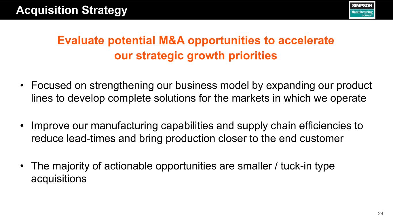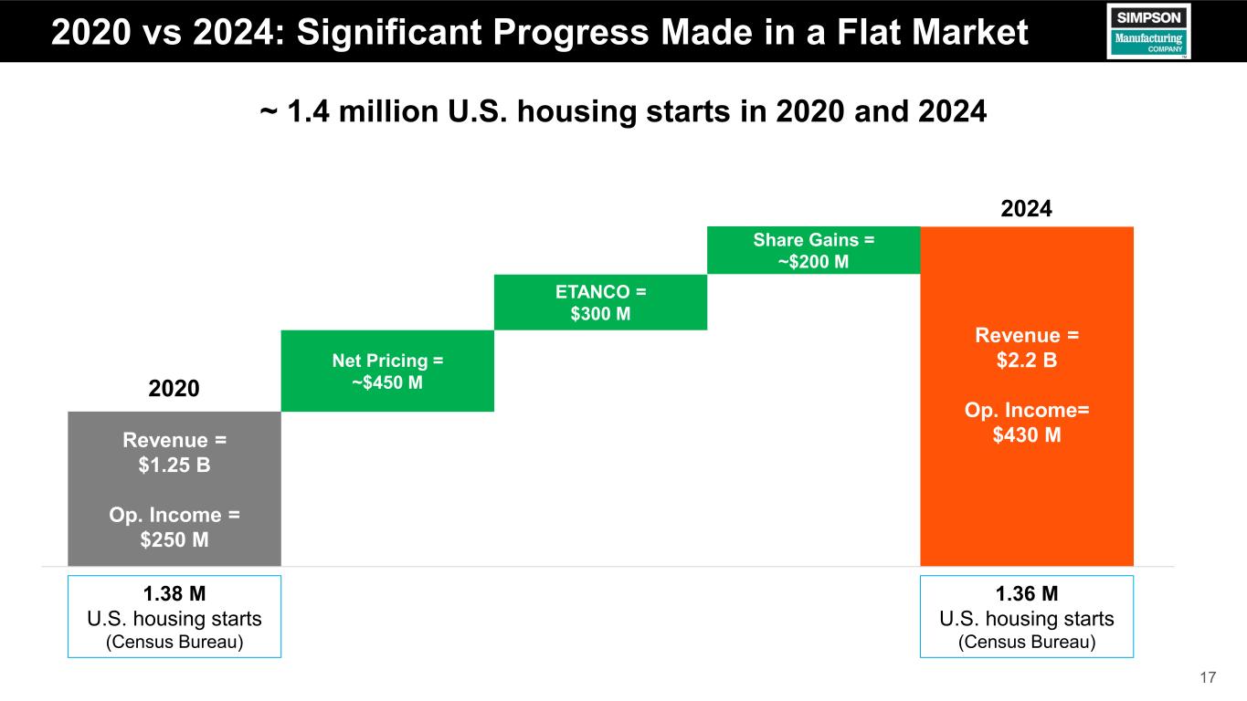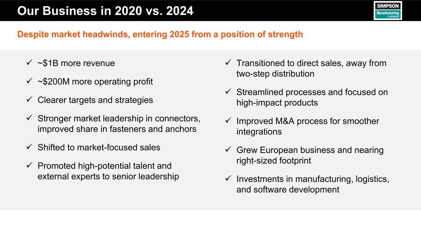 「シンプソン・マニュファクチャリング社のマイク・オロスキー社長兼最高経営責任者(CEO)は、「2024年は、米国と欧州の住宅着工件数が減少した厳しい年でしたが、売上高は小幅ながら増加しました。「北米では、出荷ポンド数の伸びが米国の住宅着工件数を約600ベーシスポイント上回ったことを大変嬉しく思います。ヨーロッパでは、厳しい需要環境にもかかわらず、売上は横ばいでした。"