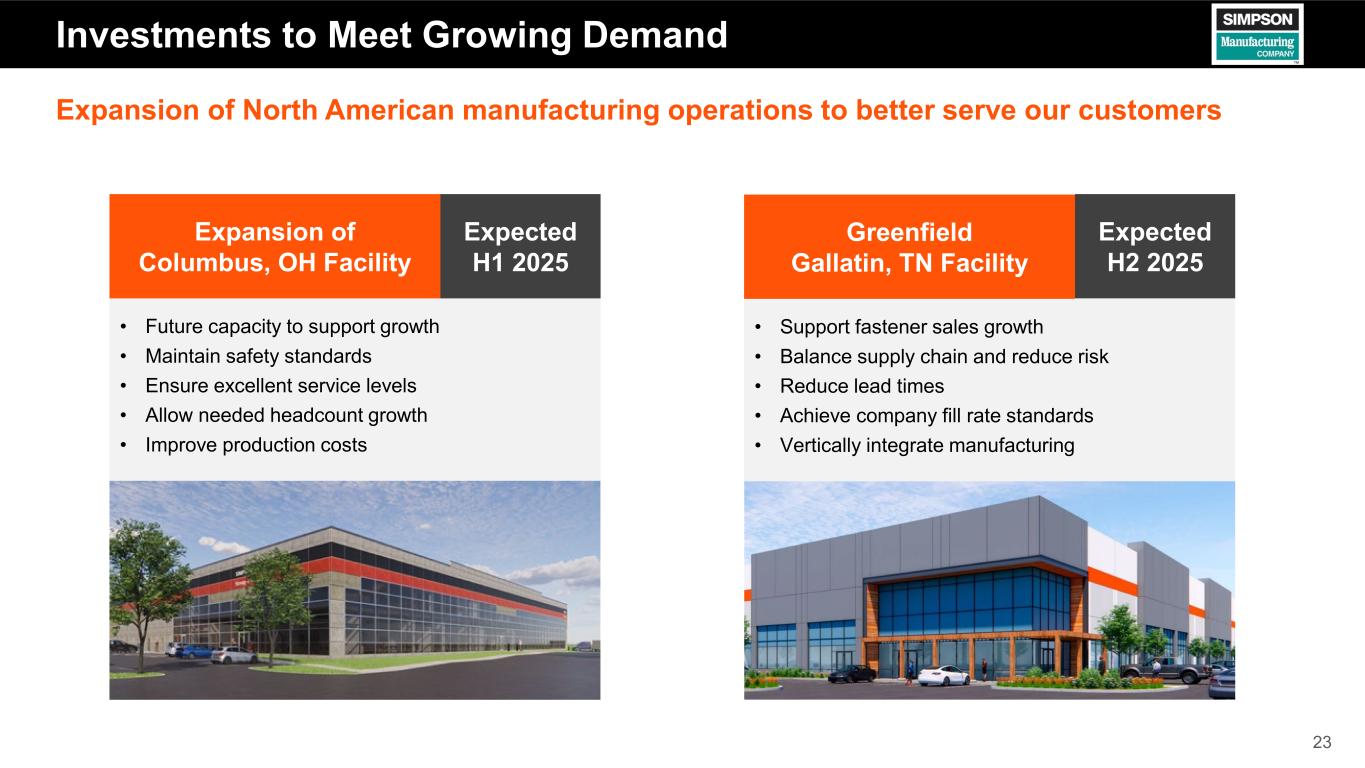 -資本支出は1億5,000万ドルから1億7,000万ドルの範囲と見積もられており、これにはオハイオ州コロンバスの施設拡張とテネシー州ギャラティンのファスナー施設新設のための残り約7,500万ドルが含まれる。
