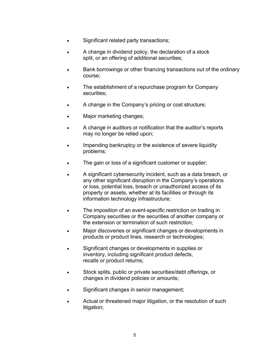 5 Significant related party transactions; A change in dividend policy, the declaration of a stock split, or an offering of additional securities; Bank borrowings or other financing transactions out of the ordinary course; The establishment of a repurchase program for Company securities; A change in the Company’s pricing or cost structure; Major marketing changes; A change in auditors or notification that the auditor’s reports may no longer be relied upon; Impending bankruptcy or the existence of severe liquidity problems; The gain or loss of a significant customer or supplier; A significant cybersecurity incident, such as a data breach, or any other significant disruption in the Company’s operations or loss, potential loss, breach or unauthorized access of its property or assets, whether at its facilities or through its information technology infrastructure; The imposition of an event-specific restriction on trading in Company securities or the securities of another company or the extension or termination of such restriction; Major discoveries or significant changes or developments in products or product lines, research or technologies; Significant changes or developments in supplies or inventory, including significant product defects, recalls or product returns; Stock splits, public or private securities/debt offerings, or changes in dividend policies or amounts; Significant changes in senior management; Actual or threatened major litigation, or the resolution of such litigation;