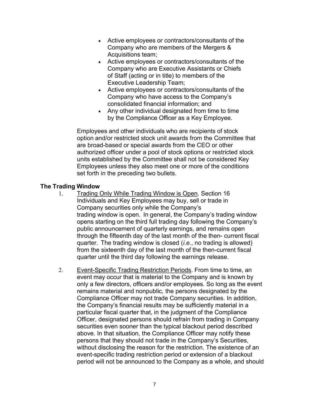 7 Active employees or contractors/consultants of the Company who are members of the Mergers & Acquisitions team; Active employees or contractors/consultants of the Company who are Executive Assistants or Chiefs of Staff (acting or in title) to members of the Executive Leadership Team; Active employees or contractors/consultants of the Company who have access to the Company’s consolidated financial information; and Any other individual designated from time to time by the Compliance Officer as a Key Employee. Employees and other individuals who are recipients of stock option and/or restricted stock unit awards from the Committee that are broad-based or special awards from the CEO or other authorized officer under a pool of stock options or restricted stock units established by the Committee shall not be considered Key Employees unless they also meet one or more of the conditions set forth in the preceding two bullets. The Trading Window 1. Trading Only While Trading Window is Open. Section 16 Individuals and Key Employees may buy, sell or trade in Company securities only while the Company’s trading window is open. In general, the Company’s trading window opens starting on the third full trading day following the Company’s public announcement of quarterly earnings, and remains open through the fifteenth day of the last month of the then- current fiscal quarter. The trading window is closed (i.e., no trading is allowed) from the sixteenth day of the last month of the then-current fiscal quarter until the third day following the earnings release. 2. Event-Specific Trading Restriction Periods. From time to time, an event may occur that is material to the Company and is known by only a few directors, officers and/or employees. So long as the event remains material and nonpublic, the persons designated by the Compliance Officer may not trade Company securities. In addition, the Company’s financial results may be sufficiently material in a particular fiscal quarter that, in the judgment of the Compliance Officer, designated persons should refrain from trading in Company securities even sooner than the typical blackout period described above. In that situation, the Compliance Officer may notify these persons that they should not trade in the Company’s Securities, without disclosing the reason for the restriction. The existence of an event-specific trading restriction period or extension of a blackout period will not be announced to the Company as a whole, and should