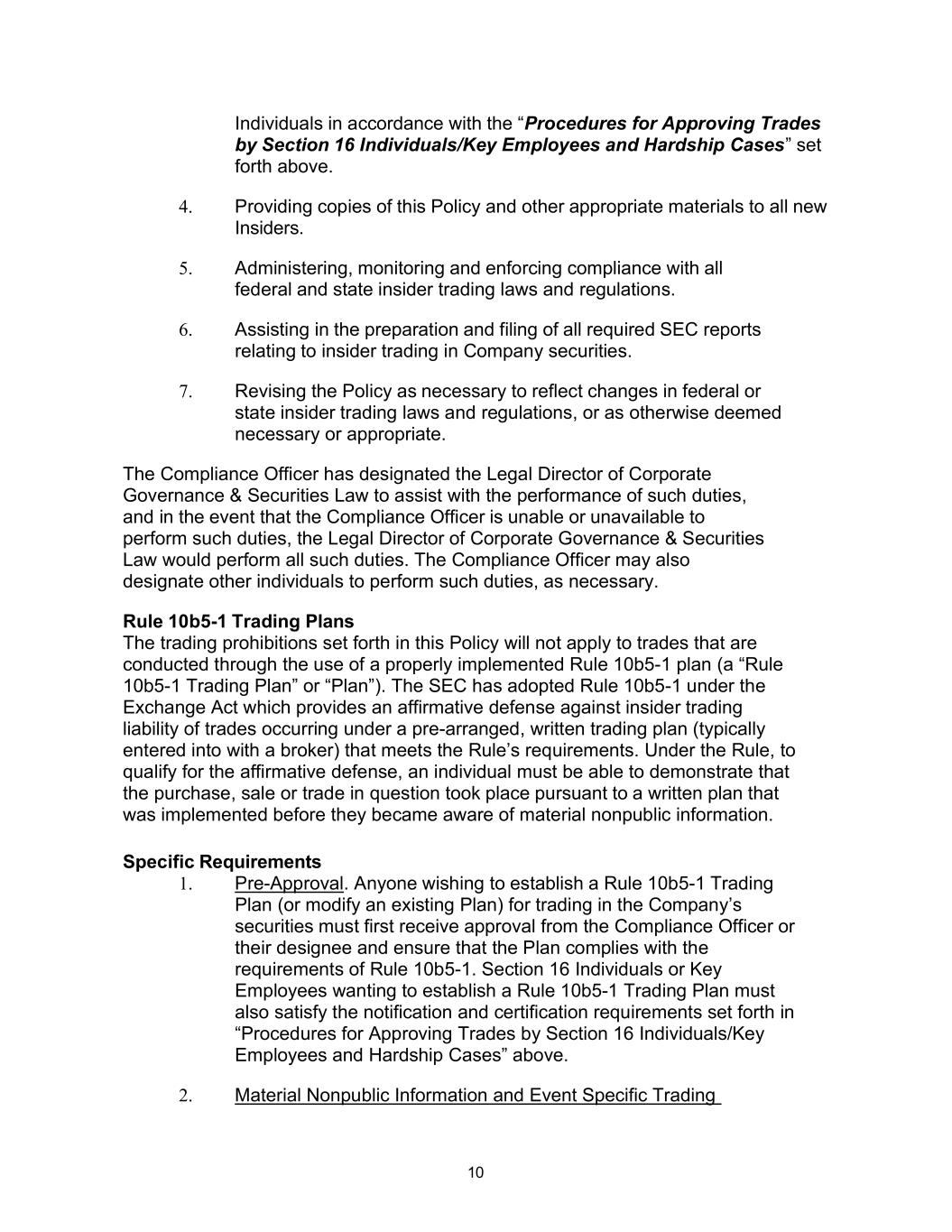 10 Individuals in accordance with the “Procedures for Approving Trades by Section 16 Individuals/Key Employees and Hardship Cases” set forth above. 4. Providing copies of this Policy and other appropriate materials to all new Insiders. 5. Administering, monitoring and enforcing compliance with all federal and state insider trading laws and regulations. 6. Assisting in the preparation and filing of all required SEC reports relating to insider trading in Company securities. 7. Revising the Policy as necessary to reflect changes in federal or state insider trading laws and regulations, or as otherwise deemed necessary or appropriate. The Compliance Officer has designated the Legal Director of Corporate Governance & Securities Law to assist with the performance of such duties, and in the event that the Compliance Officer is unable or unavailable to perform such duties, the Legal Director of Corporate Governance & Securities Law would perform all such duties. The Compliance Officer may also designate other individuals to perform such duties, as necessary. Rule 10b5-1 Trading Plans The trading prohibitions set forth in this Policy will not apply to trades that are conducted through the use of a properly implemented Rule 10b5-1 plan (a “Rule 10b5-1 Trading Plan” or “Plan”). The SEC has adopted Rule 10b5-1 under the Exchange Act which provides an affirmative defense against insider trading liability of trades occurring under a pre-arranged, written trading plan (typically entered into with a broker) that meets the Rule’s requirements. Under the Rule, to qualify for the affirmative defense, an individual must be able to demonstrate that the purchase, sale or trade in question took place pursuant to a written plan that was implemented before they became aware of material nonpublic information. Specific Requirements 1. Pre-Approval. Anyone wishing to establish a Rule 10b5-1 Trading Plan (or modify an existing Plan) for trading in the Company’s securities must first receive approval from the Compliance Officer or their designee and ensure that the Plan complies with the requirements of Rule 10b5-1. Section 16 Individuals or Key Employees wanting to establish a Rule 10b5-1 Trading Plan must also satisfy the notification and certification requirements set forth in “Procedures for Approving Trades by Section 16 Individuals/Key Employees and Hardship Cases” above. 2. Material Nonpublic Information and Event Specific Trading