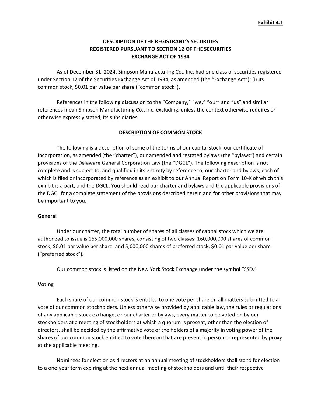 Exhibit 4.1 DESCRIPTION OF THE REGISTRANT’S SECURITIES REGISTERED PURSUANT TO SECTION 12 OF THE SECURITIES EXCHANGE ACT OF 1934 As of December 31, 2024, Simpson Manufacturing Co., Inc. had one class of securities registered under Section 12 of the Securities Exchange Act of 1934, as amended (the “Exchange Act”): (i) its common stock, $0.01 par value per share (“common stock”). References in the following discussion to the “Company,” “we,” “our” and “us” and similar references mean Simpson Manufacturing Co., Inc. excluding, unless the context otherwise requires or otherwise expressly stated, its subsidiaries. DESCRIPTION OF COMMON STOCK The following is a description of some of the terms of our capital stock, our certificate of incorporation, as amended (the “charter”), our amended and restated bylaws (the “bylaws”) and certain provisions of the Delaware General Corporation Law (the “DGCL”). The following description is not complete and is subject to, and qualified in its entirety by reference to, our charter and bylaws, each of which is filed or incorporated by reference as an exhibit to our Annual Report on Form 10-K of which this exhibit is a part, and the DGCL. You should read our charter and bylaws and the applicable provisions of the DGCL for a complete statement of the provisions described herein and for other provisions that may be important to you. General Under our charter, the total number of shares of all classes of capital stock which we are authorized to issue is 165,000,000 shares, consisting of two classes: 160,000,000 shares of common stock, $0.01 par value per share, and 5,000,000 shares of preferred stock, $0.01 par value per share (“preferred stock”). Our common stock is listed on the New York Stock Exchange under the symbol “SSD.” Voting Each share of our common stock is entitled to one vote per share on all matters submitted to a vote of our common stockholders. Unless otherwise provided by applicable law, the rules or regulations of any applicable stock exchange, or our charter or bylaws, every matter to be voted on by our stockholders at a meeting of stockholders at which a quorum is present, other than the election of directors, shall be decided by the affirmative vote of the holders of a majority in voting power of the shares of our common stock entitled to vote thereon that are present in person or represented by proxy at the applicable meeting. Nominees for election as directors at an annual meeting of stockholders shall stand for election to a one-year term expiring at the next annual meeting of stockholders and until their respective