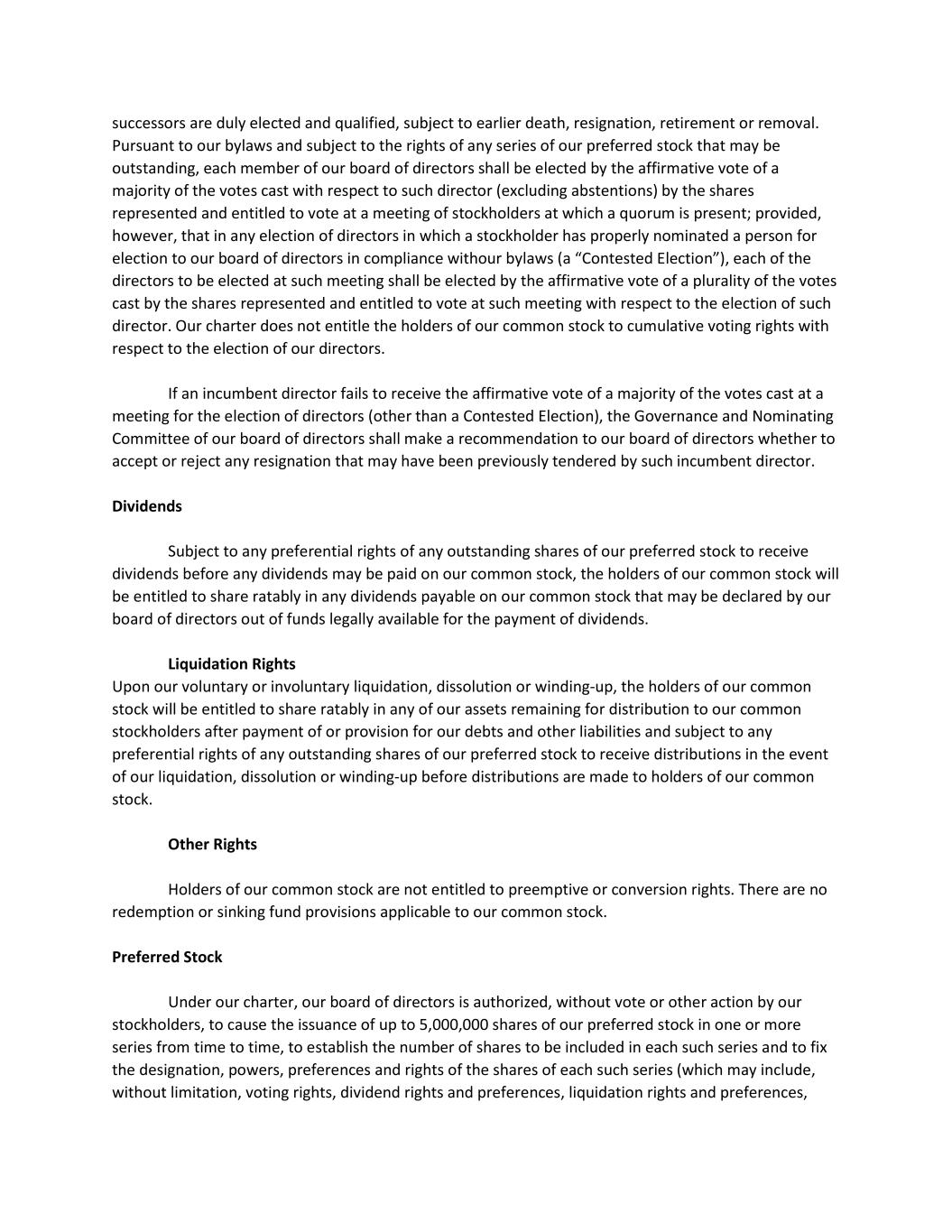 successors are duly elected and qualified, subject to earlier death, resignation, retirement or removal. Pursuant to our bylaws and subject to the rights of any series of our preferred stock that may be outstanding, each member of our board of directors shall be elected by the affirmative vote of a majority of the votes cast with respect to such director (excluding abstentions) by the shares represented and entitled to vote at a meeting of stockholders at which a quorum is present; provided, however, that in any election of directors in which a stockholder has properly nominated a person for election to our board of directors in compliance withour bylaws (a “Contested Election”), each of the directors to be elected at such meeting shall be elected by the affirmative vote of a plurality of the votes cast by the shares represented and entitled to vote at such meeting with respect to the election of such director. Our charter does not entitle the holders of our common stock to cumulative voting rights with respect to the election of our directors. If an incumbent director fails to receive the affirmative vote of a majority of the votes cast at a meeting for the election of directors (other than a Contested Election), the Governance and Nominating Committee of our board of directors shall make a recommendation to our board of directors whether to accept or reject any resignation that may have been previously tendered by such incumbent director. Dividends Subject to any preferential rights of any outstanding shares of our preferred stock to receive dividends before any dividends may be paid on our common stock, the holders of our common stock will be entitled to share ratably in any dividends payable on our common stock that may be declared by our board of directors out of funds legally available for the payment of dividends. Liquidation Rights Upon our voluntary or involuntary liquidation, dissolution or winding-up, the holders of our common stock will be entitled to share ratably in any of our assets remaining for distribution to our common stockholders after payment of or provision for our debts and other liabilities and subject to any preferential rights of any outstanding shares of our preferred stock to receive distributions in the event of our liquidation, dissolution or winding-up before distributions are made to holders of our common stock. Other Rights Holders of our common stock are not entitled to preemptive or conversion rights. There are no redemption or sinking fund provisions applicable to our common stock. Preferred Stock Under our charter, our board of directors is authorized, without vote or other action by our stockholders, to cause the issuance of up to 5,000,000 shares of our preferred stock in one or more series from time to time, to establish the number of shares to be included in each such series and to fix the designation, powers, preferences and rights of the shares of each such series (which may include, without limitation, voting rights, dividend rights and preferences, liquidation rights and preferences,