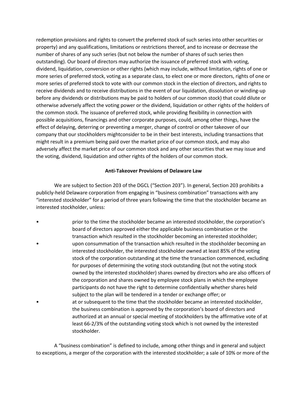redemption provisions and rights to convert the preferred stock of such series into other securities or property) and any qualifications, limitations or restrictions thereof, and to increase or decrease the number of shares of any such series (but not below the number of shares of such series then outstanding). Our board of directors may authorize the issuance of preferred stock with voting, dividend, liquidation, conversion or other rights (which may include, without limitation, rights of one or more series of preferred stock, voting as a separate class, to elect one or more directors, rights of one or more series of preferred stock to vote with our common stock in the election of directors, and rights to receive dividends and to receive distributions in the event of our liquidation, dissolution or winding-up before any dividends or distributions may be paid to holders of our common stock) that could dilute or otherwise adversely affect the voting power or the dividend, liquidation or other rights of the holders of the common stock. The issuance of preferred stock, while providing flexibility in connection with possible acquisitions, financings and other corporate purposes, could, among other things, have the effect of delaying, deterring or preventing a merger, change of control or other takeover of our company that our stockholders mightconsider to be in their best interests, including transactions that might result in a premium being paid over the market price of our common stock, and may also adversely affect the market price of our common stock and any other securities that we may issue and the voting, dividend, liquidation and other rights of the holders of our common stock. Anti-Takeover Provisions of Delaware Law We are subject to Section 203 of the DGCL (“Section 203”). In general, Section 203 prohibits a publicly-held Delaware corporation from engaging in “business combination” transactions with any “interested stockholder” for a period of three years following the time that the stockholder became an interested stockholder, unless: • prior to the time the stockholder became an interested stockholder, the corporation’s board of directors approved either the applicable business combination or the transaction which resulted in the stockholder becoming an interested stockholder; • upon consummation of the transaction which resulted in the stockholder becoming an interested stockholder, the interested stockholder owned at least 85% of the voting stock of the corporation outstanding at the time the transaction commenced, excluding for purposes of determining the voting stock outstanding (but not the voting stock owned by the interested stockholder) shares owned by directors who are also officers of the corporation and shares owned by employee stock plans in which the employee participants do not have the right to determine confidentially whether shares held subject to the plan will be tendered in a tender or exchange offer; or • at or subsequent to the time that the stockholder became an interested stockholder, the business combination is approved by the corporation’s board of directors and authorized at an annual or special meeting of stockholders by the affirmative vote of at least 66-2/3% of the outstanding voting stock which is not owned by the interested stockholder. A “business combination” is defined to include, among other things and in general and subject to exceptions, a merger of the corporation with the interested stockholder; a sale of 10% or more of the