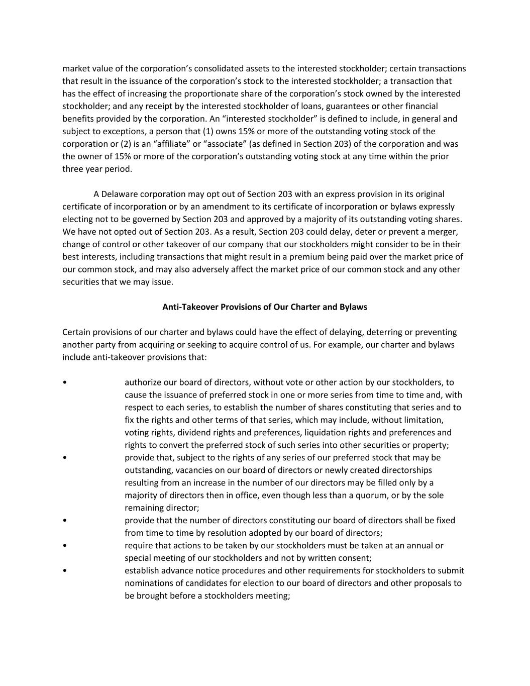 market value of the corporation’s consolidated assets to the interested stockholder; certain transactions that result in the issuance of the corporation’s stock to the interested stockholder; a transaction that has the effect of increasing the proportionate share of the corporation’s stock owned by the interested stockholder; and any receipt by the interested stockholder of loans, guarantees or other financial benefits provided by the corporation. An “interested stockholder” is defined to include, in general and subject to exceptions, a person that (1) owns 15% or more of the outstanding voting stock of the corporation or (2) is an “affiliate” or “associate” (as defined in Section 203) of the corporation and was the owner of 15% or more of the corporation’s outstanding voting stock at any time within the prior three year period. A Delaware corporation may opt out of Section 203 with an express provision in its original certificate of incorporation or by an amendment to its certificate of incorporation or bylaws expressly electing not to be governed by Section 203 and approved by a majority of its outstanding voting shares. We have not opted out of Section 203. As a result, Section 203 could delay, deter or prevent a merger, change of control or other takeover of our company that our stockholders might consider to be in their best interests, including transactions that might result in a premium being paid over the market price of our common stock, and may also adversely affect the market price of our common stock and any other securities that we may issue. Anti-Takeover Provisions of Our Charter and Bylaws Certain provisions of our charter and bylaws could have the effect of delaying, deterring or preventing another party from acquiring or seeking to acquire control of us. For example, our charter and bylaws include anti-takeover provisions that: • authorize our board of directors, without vote or other action by our stockholders, to cause the issuance of preferred stock in one or more series from time to time and, with respect to each series, to establish the number of shares constituting that series and to fix the rights and other terms of that series, which may include, without limitation, voting rights, dividend rights and preferences, liquidation rights and preferences and rights to convert the preferred stock of such series into other securities or property; • provide that, subject to the rights of any series of our preferred stock that may be outstanding, vacancies on our board of directors or newly created directorships resulting from an increase in the number of our directors may be filled only by a majority of directors then in office, even though less than a quorum, or by the sole remaining director; • provide that the number of directors constituting our board of directors shall be fixed from time to time by resolution adopted by our board of directors; • require that actions to be taken by our stockholders must be taken at an annual or special meeting of our stockholders and not by written consent; • establish advance notice procedures and other requirements for stockholders to submit nominations of candidates for election to our board of directors and other proposals to be brought before a stockholders meeting;