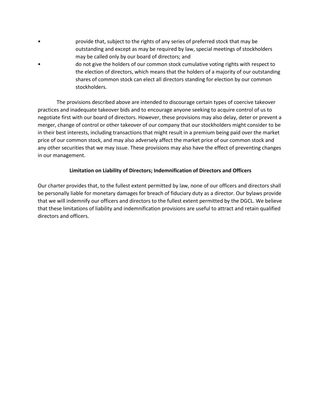 • provide that, subject to the rights of any series of preferred stock that may be outstanding and except as may be required by law, special meetings of stockholders may be called only by our board of directors; and • do not give the holders of our common stock cumulative voting rights with respect to the election of directors, which means that the holders of a majority of our outstanding shares of common stock can elect all directors standing for election by our common stockholders. The provisions described above are intended to discourage certain types of coercive takeover practices and inadequate takeover bids and to encourage anyone seeking to acquire control of us to negotiate first with our board of directors. However, these provisions may also delay, deter or prevent a merger, change of control or other takeover of our company that our stockholders might consider to be in their best interests, including transactions that might result in a premium being paid over the market price of our common stock, and may also adversely affect the market price of our common stock and any other securities that we may issue. These provisions may also have the effect of preventing changes in our management. Limitation on Liability of Directors; Indemnification of Directors and Officers Our charter provides that, to the fullest extent permitted by law, none of our officers and directors shall be personally liable for monetary damages for breach of fiduciary duty as a director. Our bylaws provide that we will indemnify our officers and directors to the fullest extent permitted by the DGCL. We believe that these limitations of liability and indemnification provisions are useful to attract and retain qualified directors and officers.