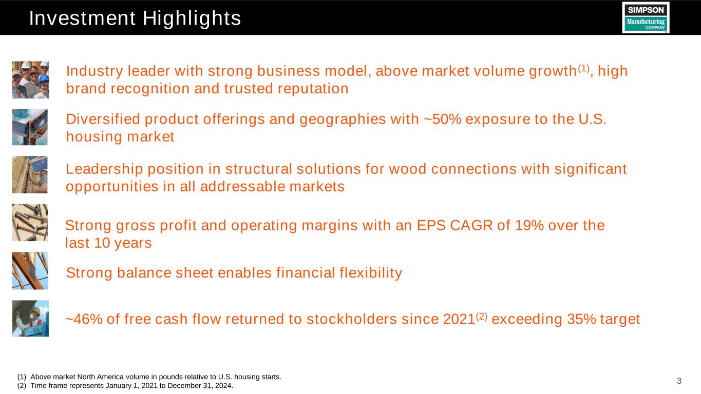 3 Investment Highlights Industry leader with strong business model, above market volume growth(1), high brand recognition and trusted reputation Diversified product offerings and geographies with ~50% exposure to the U.S. housing market Leadership position in structural solutions for wood connections with significant opportunities in all addressable markets Strong gross profit and operating margins with an EPS CAGR of 19% over the last 10 years Strong balance sheet enables financial flexibility ~46% of free cash flow returned to stockholders since 2021(2) exceeding 35% target (1) Above market North America volume in pounds relative to U.S. housing starts. (2) Time frame represents January 1, 2021 to December 31, 2024.
