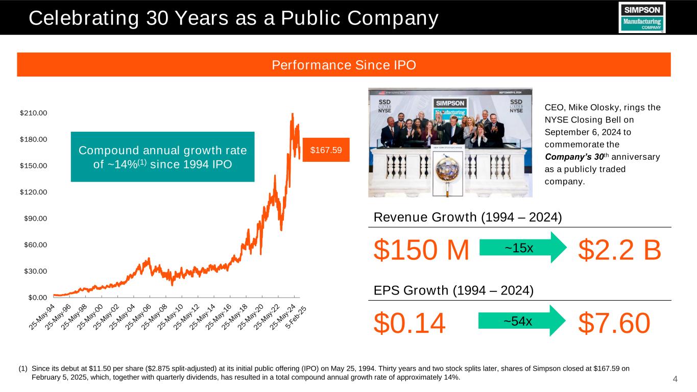4 Celebrating 30 Years as a Public Company Performance Since IPO CEO, Mike Olosky, rings the NYSE Closing Bell on September 6, 2024 to commemorate the Company’s 30th anniversary as a publicly traded company. (1) Since its debut at $11.50 per share ($2.875 split-adjusted) at its initial public offering (IPO) on May 25, 1994. Thirty years and two stock splits later, shares of Simpson closed at $167.59 on February 5, 2025, which, together with quarterly dividends, has resulted in a total compound annual growth rate of approximately 14%. Revenue Growth (1994 – 2024) $0.14 ~15x $2.2 B EPS Growth (1994 – 2024) $150 M ~54x $7.60 $167.59Compound annual growth rate of ~14%(1) since 1994 IPO $0.00 $30.00 $60.00 $90.00 $120.00 $150.00 $180.00 $210.00