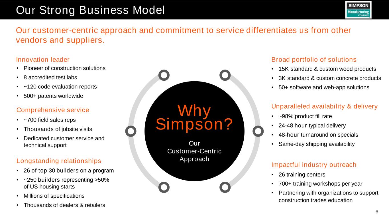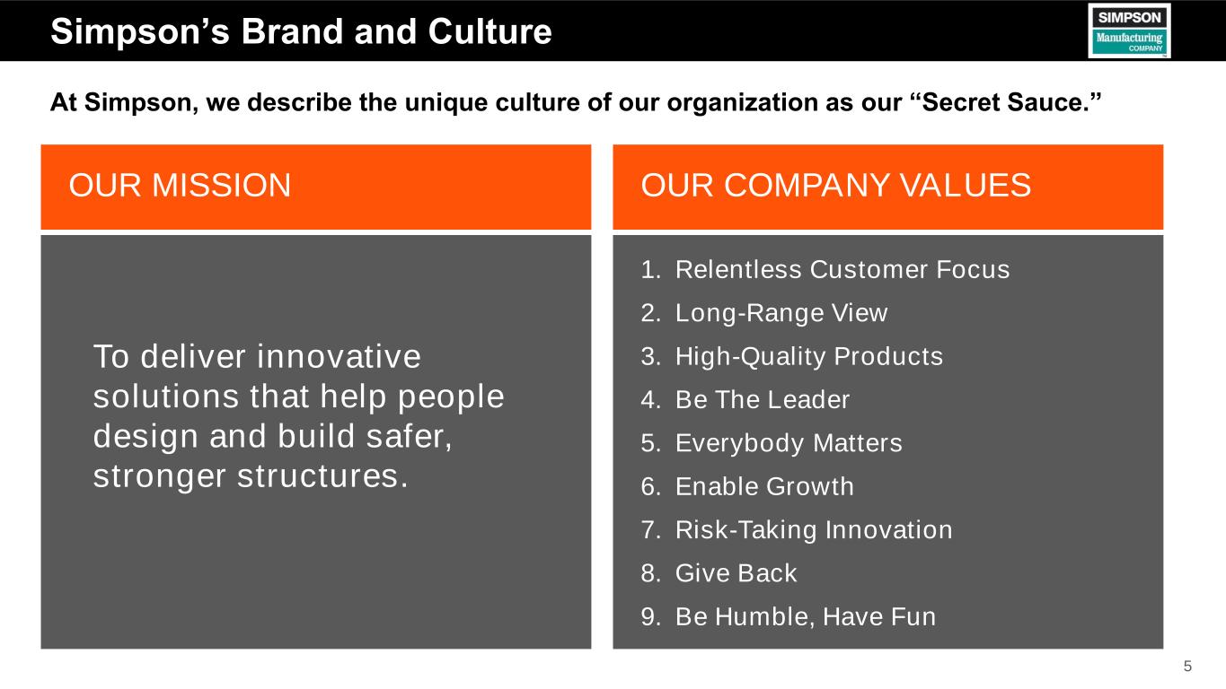 5 Simpson’s Brand and Culture At Simpson, we describe the unique culture of our organization as our “Secret Sauce.” To deliver innovative solutions that help people design and build safer, stronger structures. OUR MISSION OUR COMPANY VALUES 1. Relentless Customer Focus 2. Long-Range View 3. High-Quality Products 4. Be The Leader 5. Everybody Matters 6. Enable Growth 7. Risk-Taking Innovation 8. Give Back 9. Be Humble, Have Fun